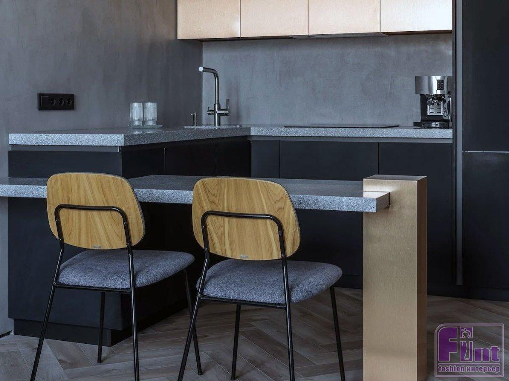 Хозяйка квартиры немного готовит, поэтому дизайнер сделала конструкцию кухни «парадной». Встраиваемые духовой шкаф и микроволновка перенесены на площадь коридора, их не видно из гостиной. Так кухня выглядит монолитно. Металлизированные фасады верхних шкафов и опора барной стойки, которая заменяет стол, вдохновлены отделкой входных групп в жилом комплексе.