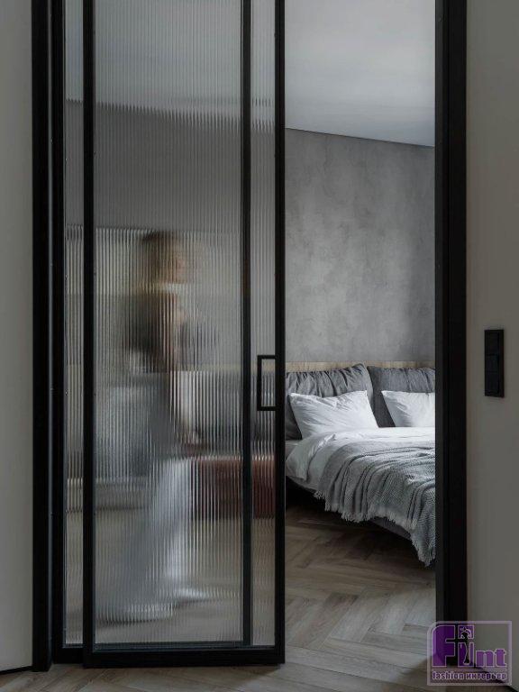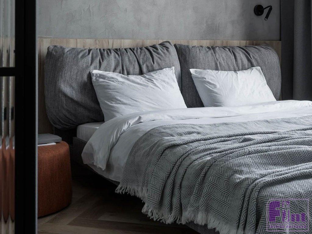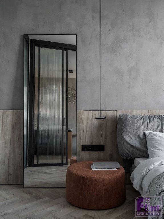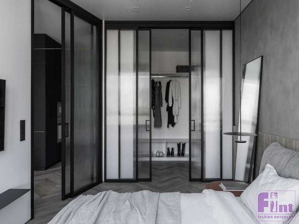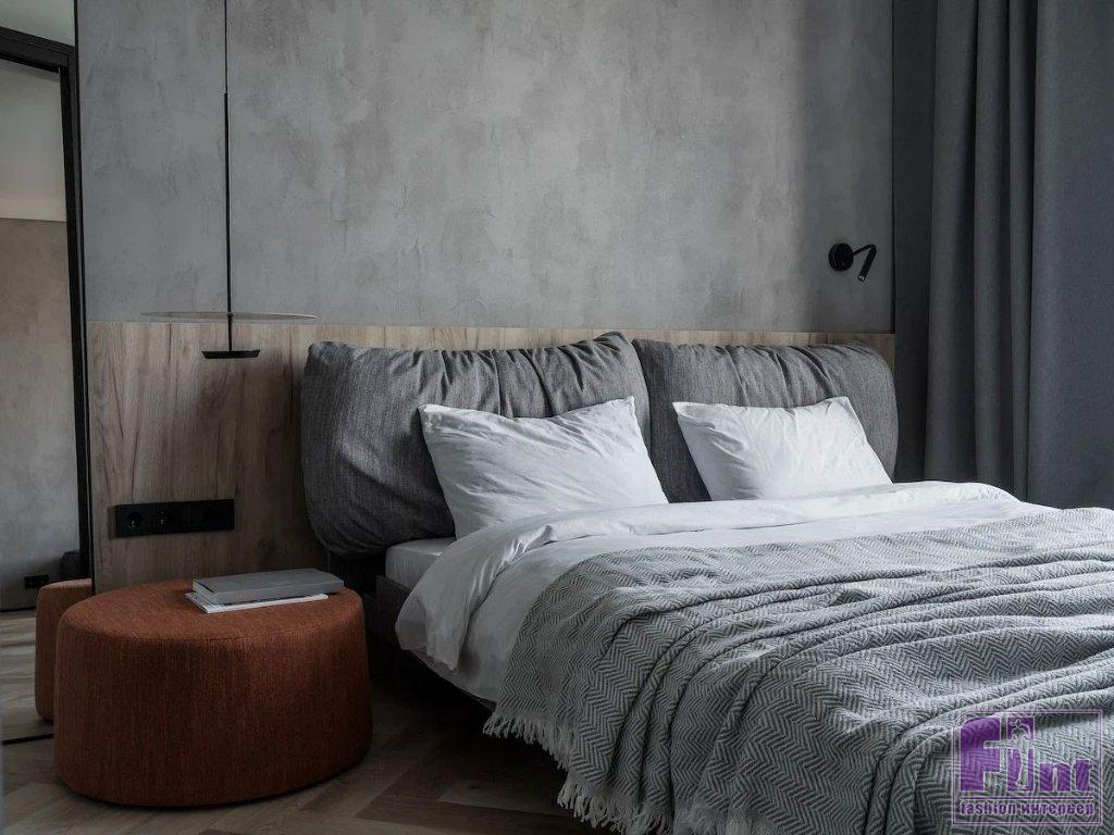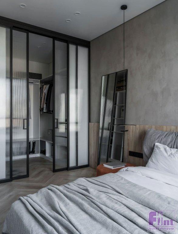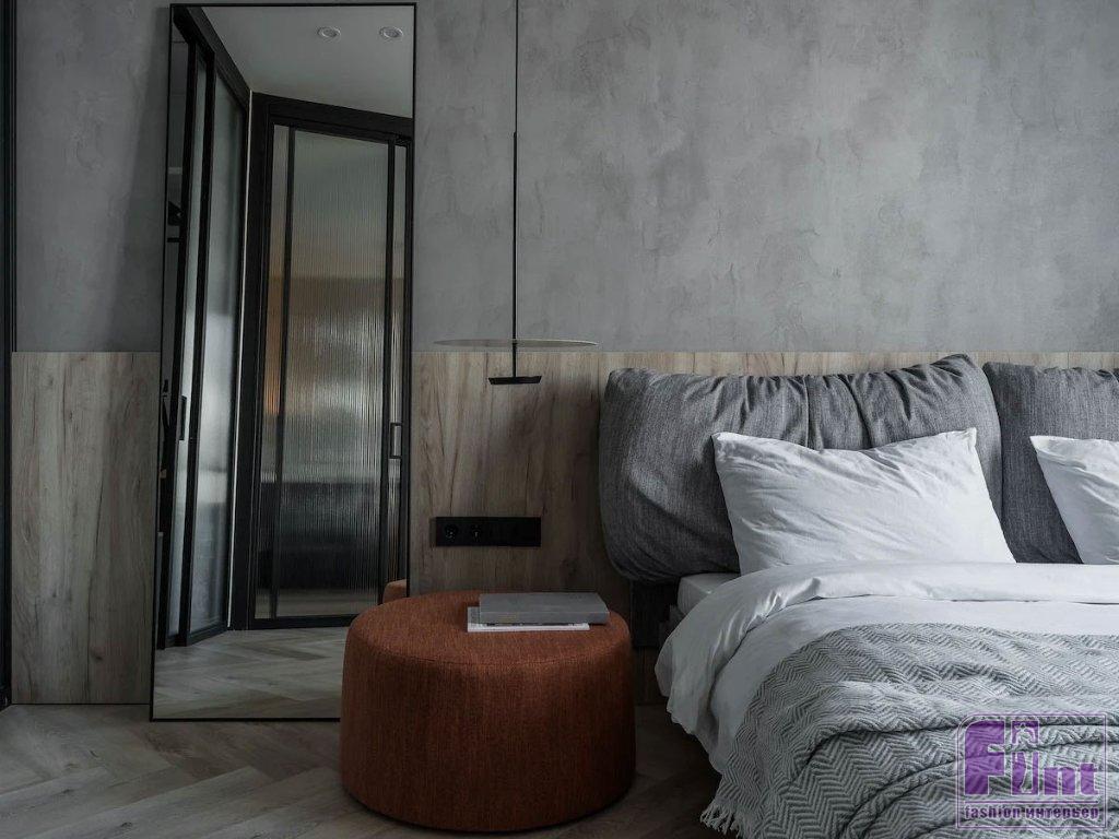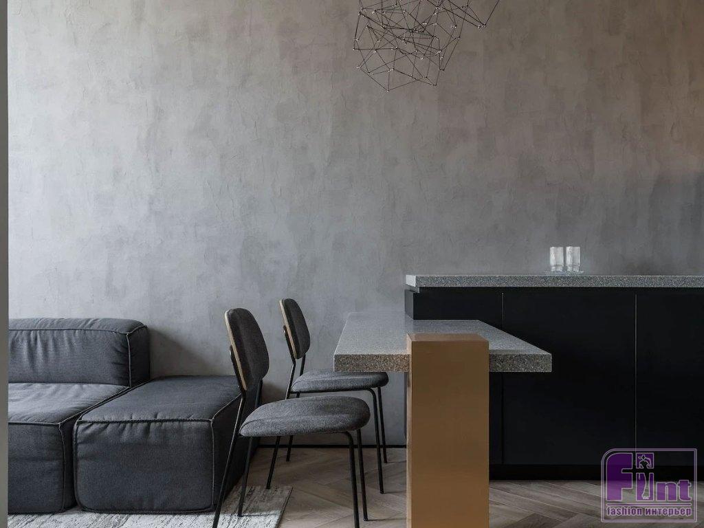 Для оформления стен выбрали светлую краску. Стену в изголовье кровати, за диваном и в зоне кухни оформили микроцементом с имитацией бетонной штукатурки. На полу по всей площади, исключая санузел — кварцвинил. В санузле керамогранит с микроцементом. Дверь в спальню заменили стеклянной перегородкой, такую же перегородку выбрали для отделения гардеробной от спальни.