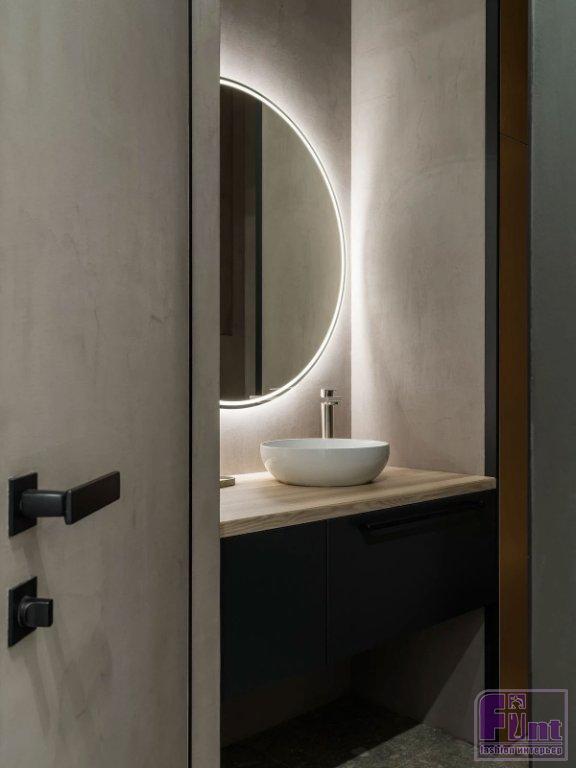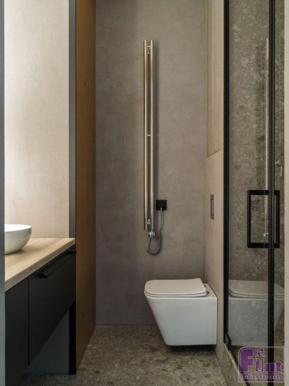 Натяжной потолок сделан с теневым профилем. Плинтус — тоже теневой. Дверь в санузел — скрытого монтажа, на фоне стены она практически незаметна. Все это признаки современного минималистичного интерьера. А фактуры — микроцемент, кварцвинил под дерево, керамогранит — «разбавляют» монотонность минимализма.
