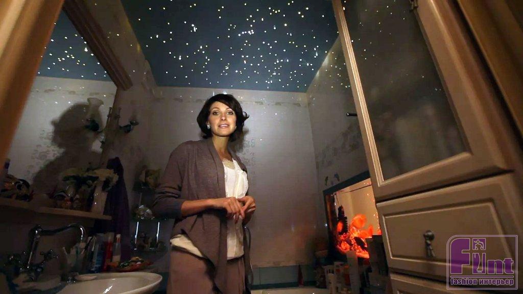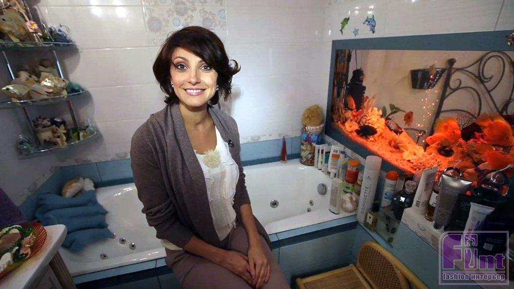 Ванная актрисы отделана в нежно голубом цвете, который нравится хозяйке дома. «Это мой маленький SPA-центр», – говорит Анастасия. Здесь действительно есть всё для релаксации: аквариум с рыбками, который в ванной выглядит как живая картина, ванная с хромотерапией и звёздное небо, усыпанное кристаллами Swarovski. «При выключенном свете потолок в ванной переливается как звёздное небо: крупными кристаллами выложены созвездия козерога и рака», – рассказывает Макеева. В ванной нашлось место и для продолжения коллекции: здесь выставлены рыбки и ангелочки.