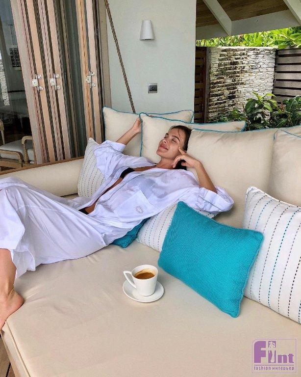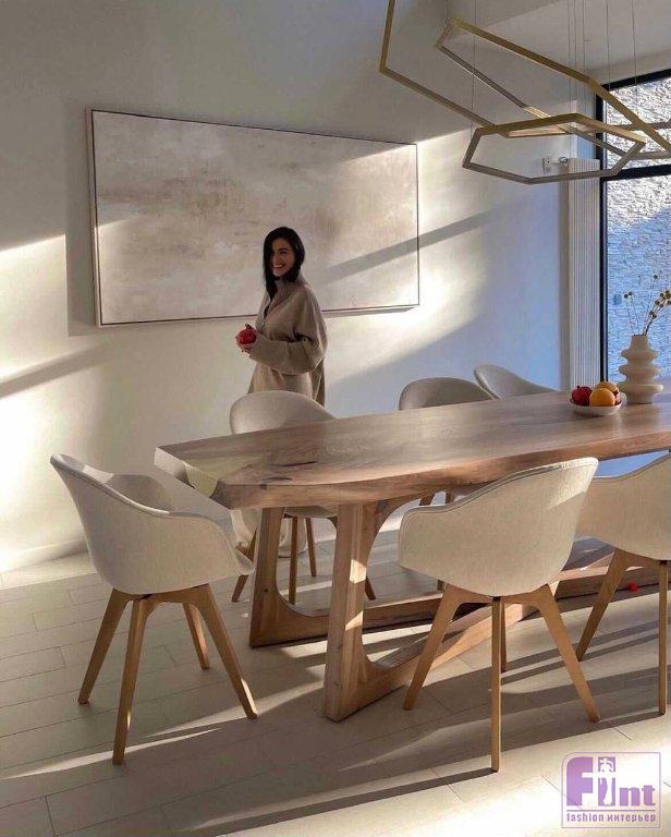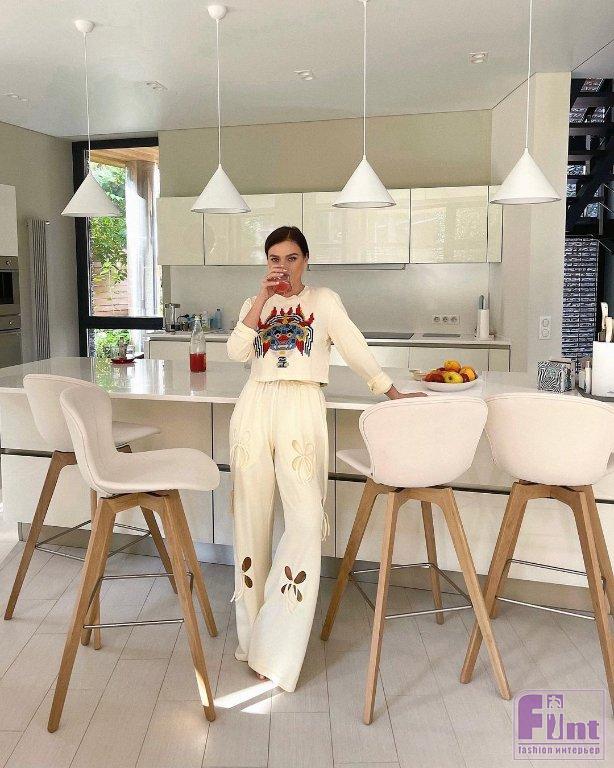 Любимым местом фотосессий и встреч с близкими стала белоснежная кухня, совмещённая с зоной столовой и гостиной. В уютное светлое пространство органично вписались белоснежная глянцевая мебель, барная стойка со стульями и диван со светлой обивкой. С него открывается панорамный вид на веранду и внутренний сад. Сердцем столовой стал огромный стол из цельного дерева, покрытого специальным лаком. Стол окружают восемь стульев с мягкой бежевой отделкой.