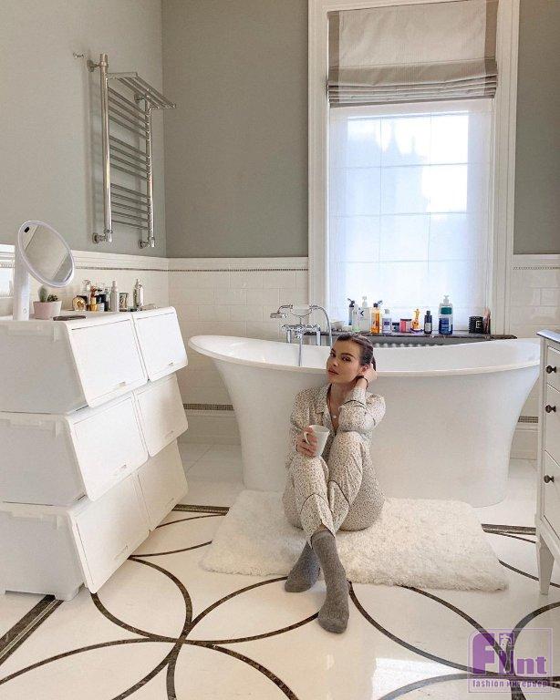 Певица показала просторную ванную комнату на втором этаже дома. Ее стены выполнены из белоснежного мрамора с серым тиснением. Здесь нет ничего лишнего: отдельная ванна, серый подвесной шкаф с раковиной, круглое зеркало с подсветкой и подвесные светильники. Из элементов декора — полка с растениями, косметическое зеркало с отделкой из золота, подставки для косметики.