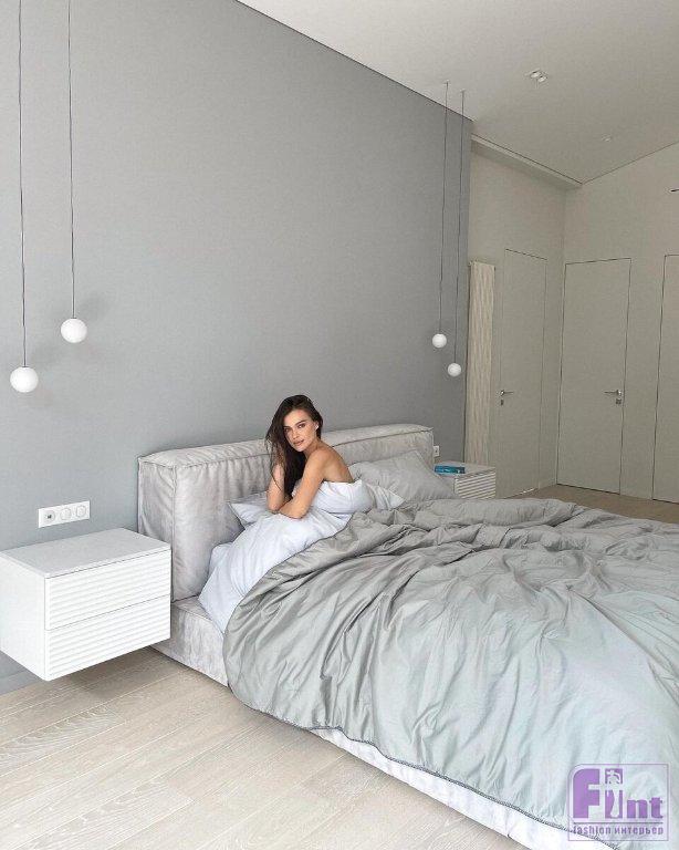 Рядом с ванной находится спальня Лены Темниковой. Стены комнаты покрыты светло-серой краской. В центре низкая кровать с мягким изголовьем, а рядом белоснежный рельефный подвесной шкаф. Четыре светильника симметрично подвешены к потолку и спускаются к изголовью кровати.