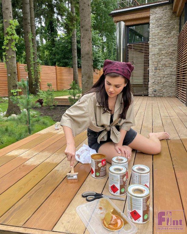 Снаружи дом Елены Темниковой отделан в стиле экоминимализма. Основные материалы, использованные при строительстве, — дерево, стекло и металл. Схожим образом оформлен и участок. Здесь нет ни одного лишнего элемента. Основную часть территории занимает газон с несколькими деревьями и кустарниками. Такой дизайн Елена Темникова выбрала совместно с мужем — оба супруга не имеют лишнего времени для ухода за садом, и газон стал отличным выходом из ситуации. Кстати, часть отделочных работ певица выполняла самостоятельно. Например, она решила покрасить террасу собственными руками, не нанимая для этого рабочих.