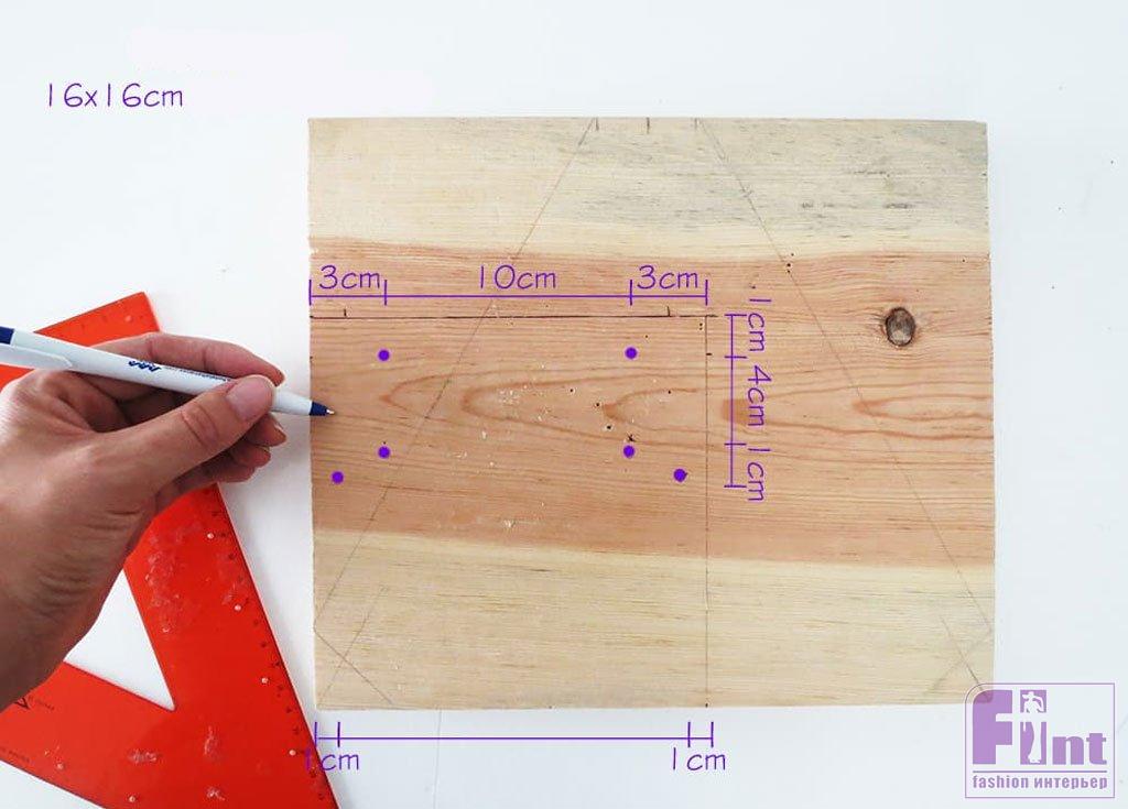 Начните с того, что вырежьте из деревянной дощечки квадрат размером 16 × 16 см. С помощью линейки и карандаша отметьте на заготовке 6 мест, где вам нужно будет просверлить маленькие отверстия для установки проволочных рамок. Следуйте измерениям, указанным на рисунке.