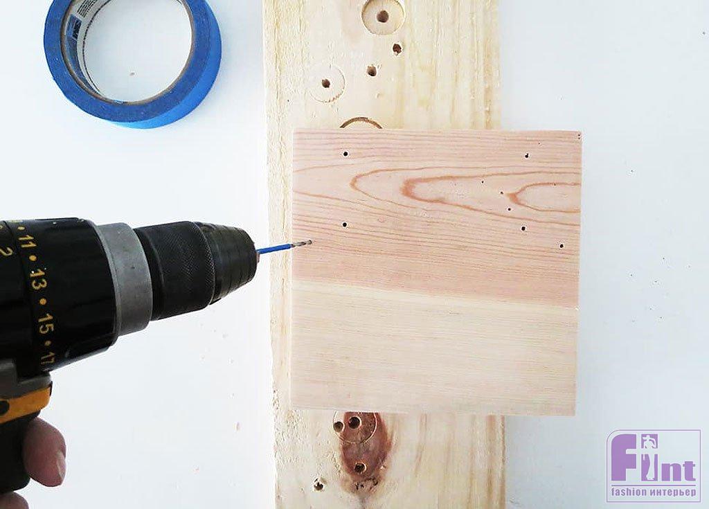 Используйте сверло той же толщины, что и проволока для вешалки. Держите сверло вертикально и просверлите отверстия. Не просверливайте всю древесину насквозь. Чтобы вовремя прекратить сверление, намотайте на сверло кусочек клейкой ленты на расстоянии 1,5 см от наконечника, чтобы вы знали, что, когда лента достигнет поверхности дерева, можно прекращать сверление. Отшлифуйте деревянную основу и, при желании, покройте ей защитным лаком.