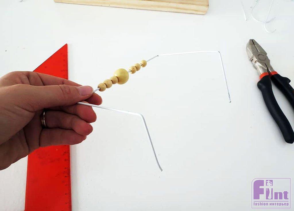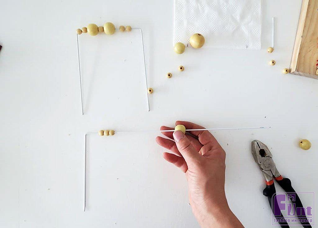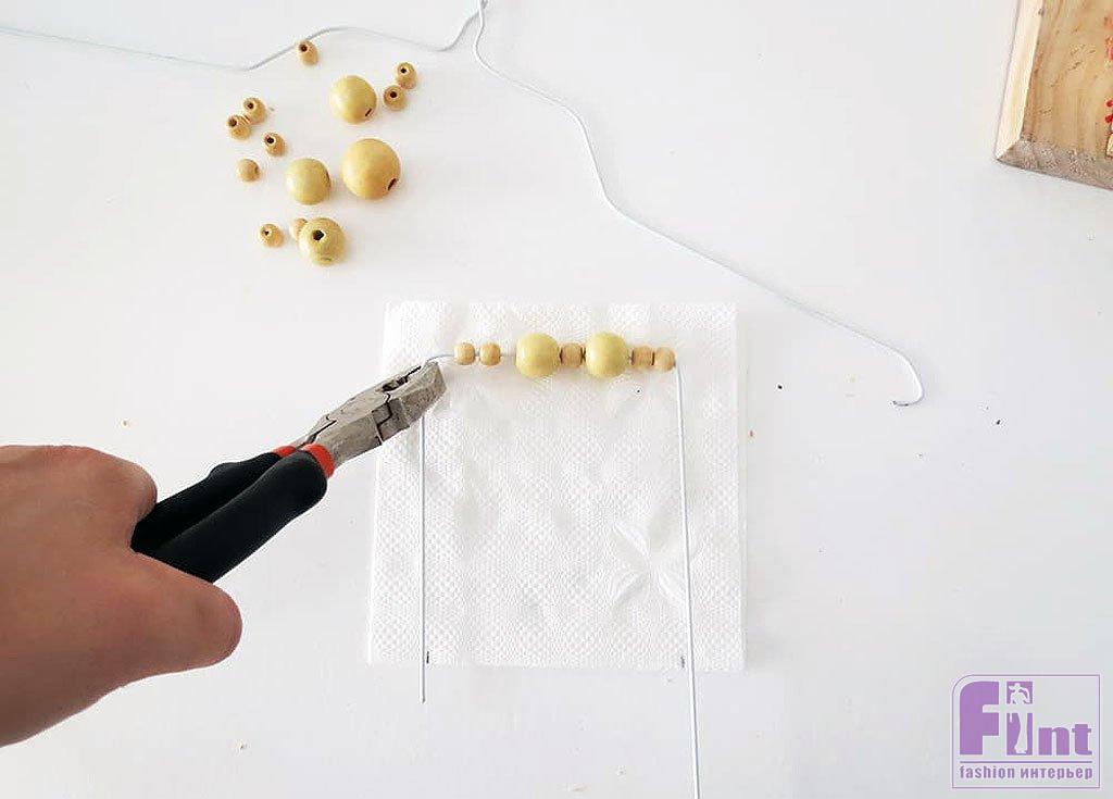 Для крепления салфеток вам нужно сделать из проволоки две П-образные формы. Отрежьте длинную часть вешалки для одежды и с помощью плоскогубцев согните первый угол в 90 градусов. Пропустите несколько бусин через проволоку, и согните её под углом в 90 градусов ещё раз. П–образная форма имеет следующие размеры: 13 см х 10 см х 13 см.