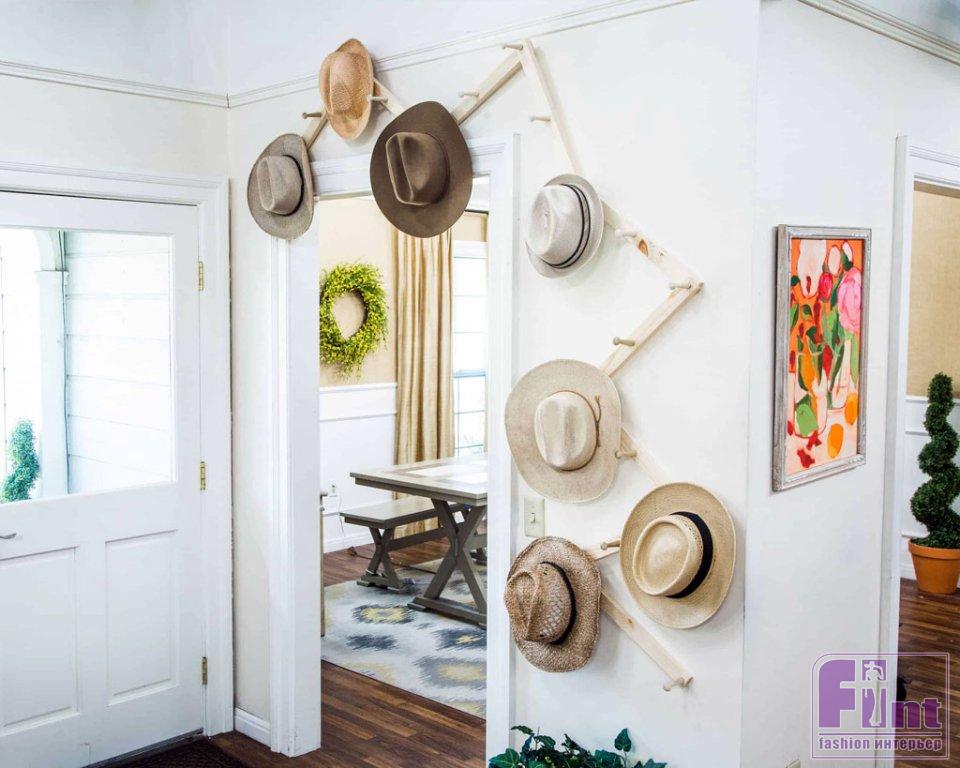 Шляпы и другие многочисленные варианты головных уборов также являются излюбленными аксессуарами, которыми дизайнеры любят декорировать пустые стены в стильных интерьерах. Головные уборы могут быть представлены классическими шляпами, соломенными головными уборами, этническими изделиями и даже спортивными бейсболками. Особняком в этом способе украшения стен стоят знаменитые камерунские шляпы из перьев Juju Hat.