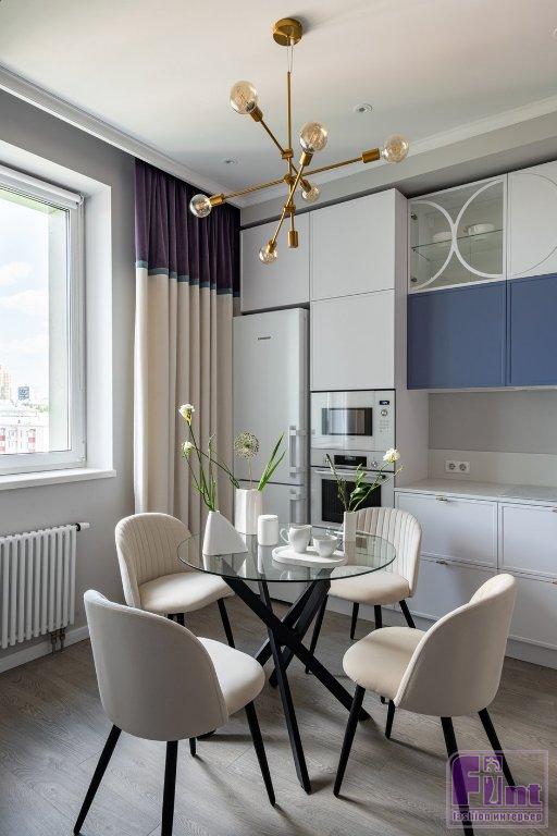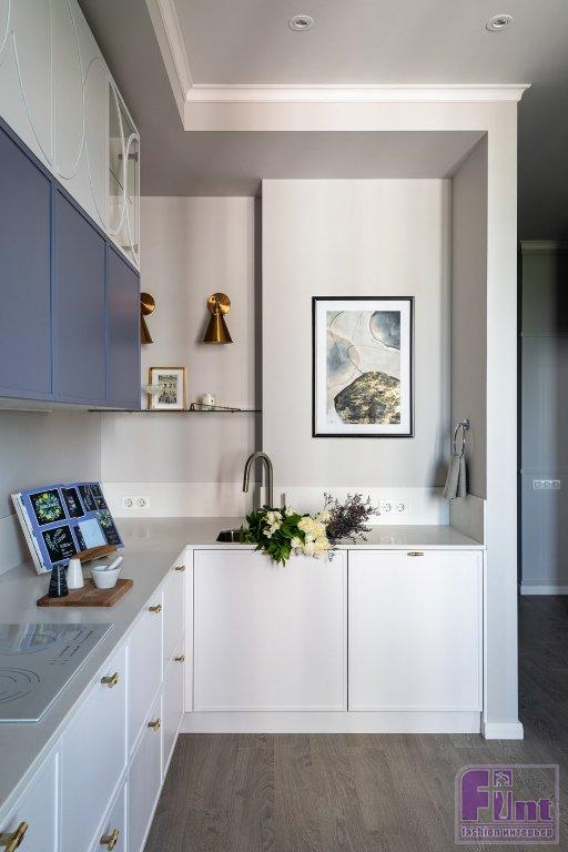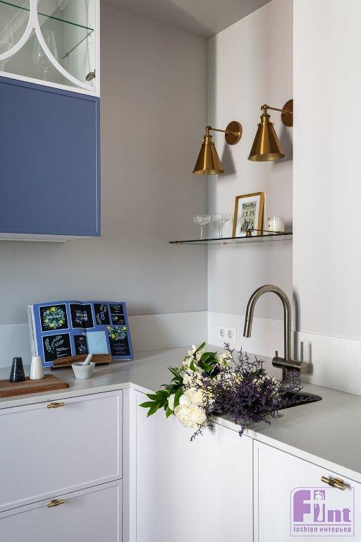 Кухонный гарнитур Г-образный, сделан на заказ по эскизам дизайнера. Для того чтобы гарнитур не был слишком громоздким, верхние шкафчики разместили только над зоной готовки. Фасады двух верхних шкафов заменили фасадами со стеклом и предусмотрели подсветку внутри — это добавило ещё больше лёгкости композиции. Техника в зоне готовки — духовой шкаф и СВЧ-печь. Столешница довольно широкая, также остается место под бытовую технику типа чайника, кофемашины. В зоне мойки — удобная раковина подстольного монтажа, рядом с ней — посудомоечная машина. Одной из особенностей кухни стала небольшая ниша в углу, которую решили не закрывать. Столешницу в этом месте сделали глубже, а сверху установили стеклянную полочку для бокалов и подсветку в виде бра.