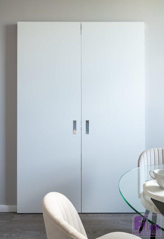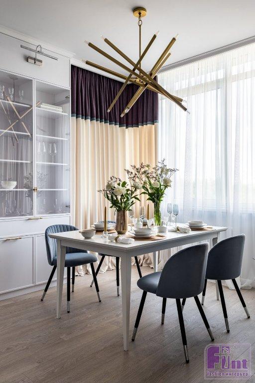 Хозяйка очень гостеприимная, поэтому в гостиной был предусмотрен большой раскладной диван, а также раздвижная дверь на кухню, чтобы у оставшихся на ночь гостей была возможность выспаться в уединении. Прямоугольный стол в обеденной зоне в гостиной раскладывается, за ним может уместиться до восьми человек. В качестве акцента на стенах в спальне и гостиной — гипсовые панели с объёмом, напоминающим каннелюры — изящные вертикальные желобки на колонне. Такой рисунок на панелях добавляет античности и классики в пространство, делает его более фактурным и объёмным.
