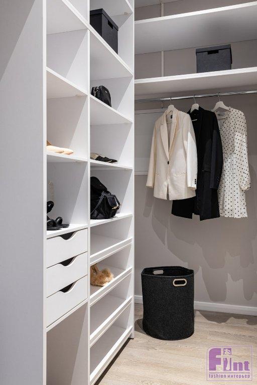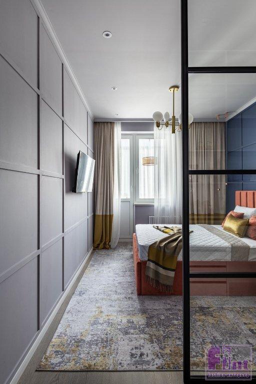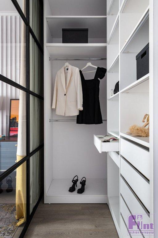 Изначально в планировке квартиры при входе был очень большой холл, его площадь составляла 20 квадратных метров. Дизайнер не стала увеличивать гостиную за счет этой зоны, но предложила возвести в холле стены для отдельной гардеробной. Это помещение в итоге отделяет гостевую зону (кухню, гостиную и прихожую с санузлом) от приватной зоны (спальни, кабинета и ванны). Также нужно было предусмотреть комнату, которая одновременно будет и спальней для маленькой внучки, и кабинетом для хозяйки квартиры. Когда ребенок подрастёт, детская кроватка с бортиками будет заменена на раскладной диван.