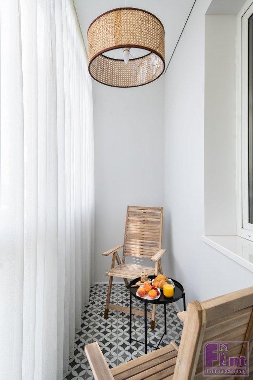 Гардеробную отделили от зоны сна при помощи лофт-перегородки. Излишнюю грубость и холод стекла смягчили при помощи портьеры. В квартире есть две лоджии, которые было решено не утеплять. Однако там удалось организовать небольшой уголок для отдыха в тёплое время года. Для более комфортного проведения прохладных вечеров на обеих лоджиях был предусмотрен тёплый пол.