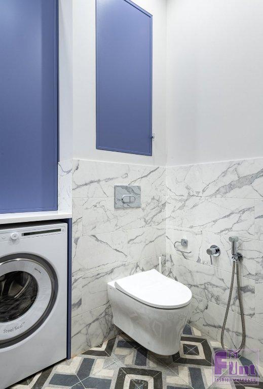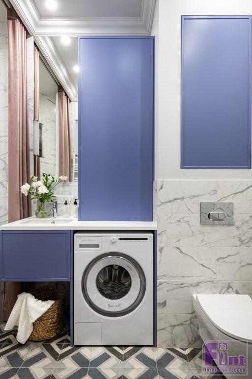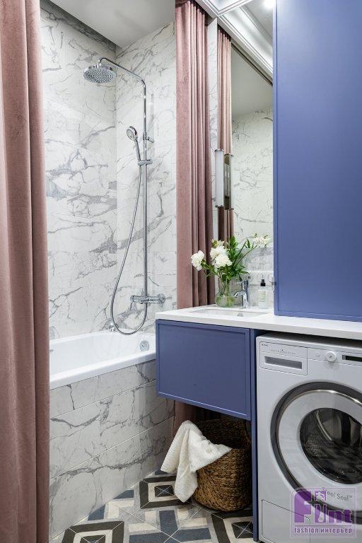 Отделка стен санузла — это мелкоформатная плитка голубого цвета и серо-бежевая краска. Изюминку маленькому гостевому санузлу добавляет интересная люстра, «рисующая» на стенах причудливые круглые узоры. Благодаря этому небольшая комната в нежных бежево-голубых оттенках получилась не только уютной, но и утонченной. В зоне ванны плитку выложили до потолка. В остальной части помещения — на высоту 125 см. Текстильная портьера со стороны раковины добавляет уюта помещению. Со стороны ванны — обычная белая шторка, которая закрывается, когда необходимо принять душ. Также привлекает внимание ярко-фиолетовый акцентный шкаф, где разместили и зону умывания, и зону стирки, и зону хранения.