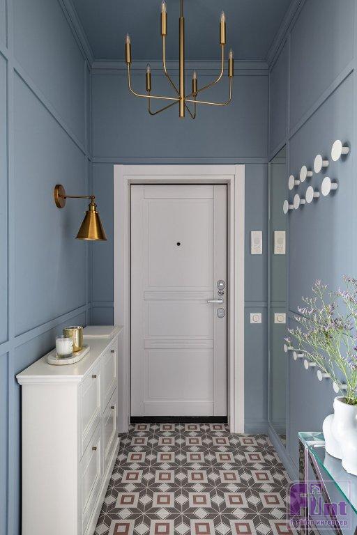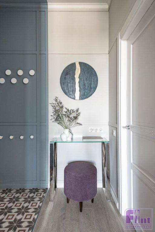 «Последнее по списку, но не по назначению помещение — прихожая — получилось у нас достаточно парадным и функциональным, несмотря на скромные размеры — всего два квадратных метра. Тут разместились узкая обувница, крючки для одежды и пуф. Эту зону мы решили выделить пыльно-голубым цветом, окрасив в этот цвет, в том числе, и потолок», — рассказывает дизайнер.