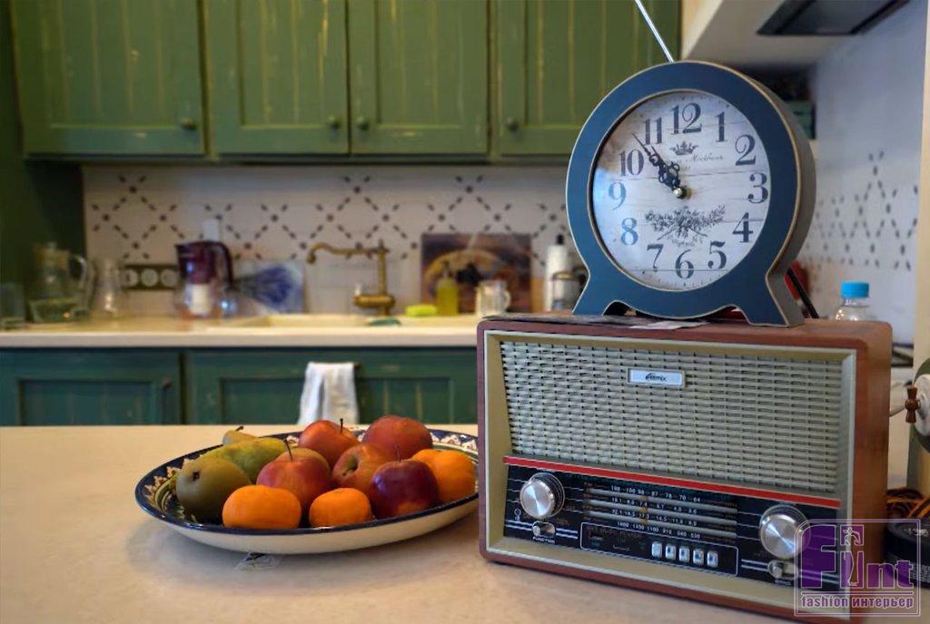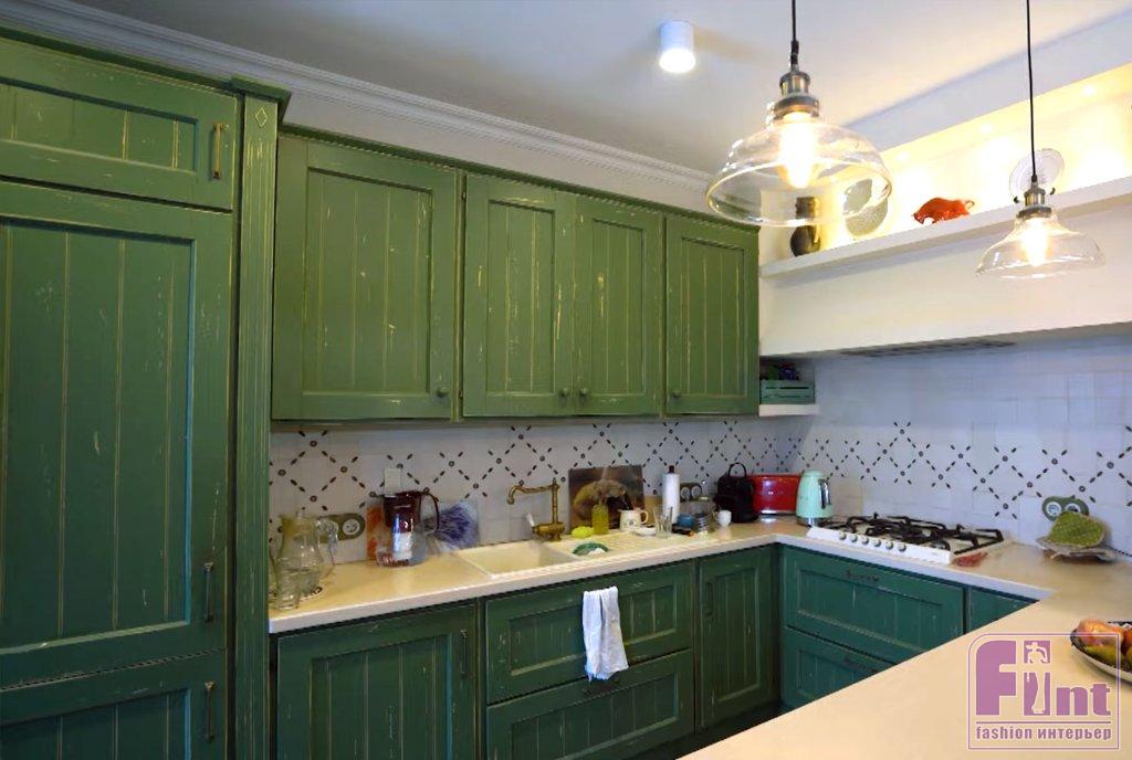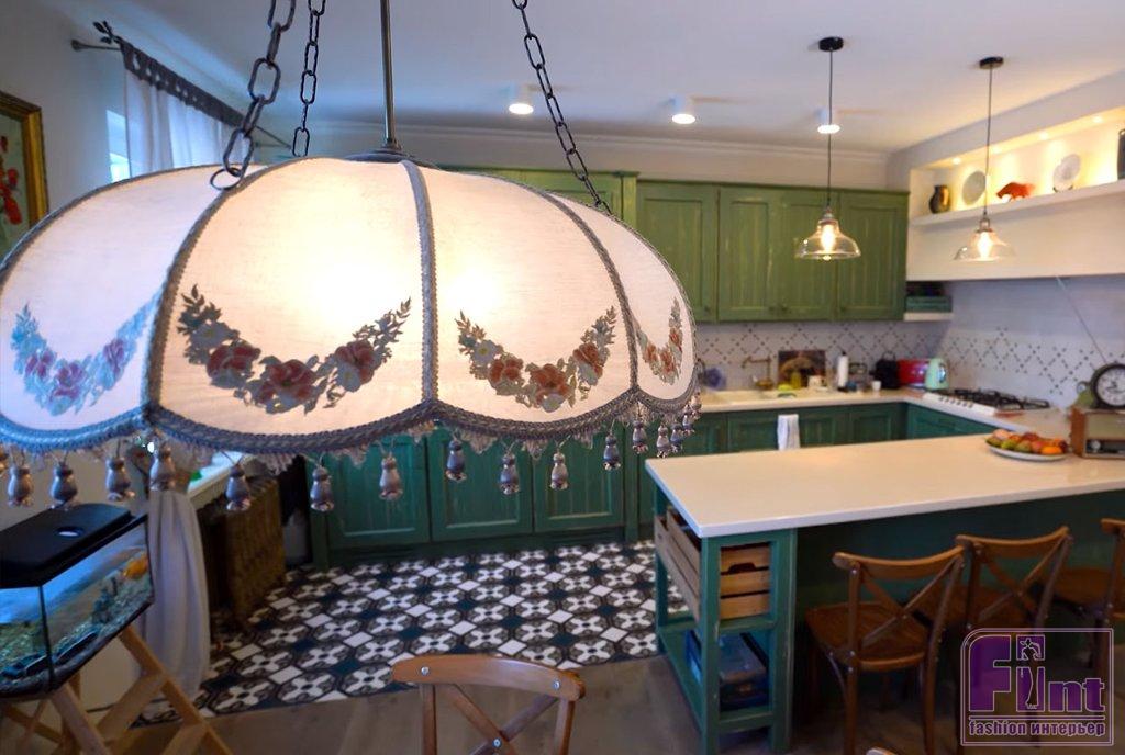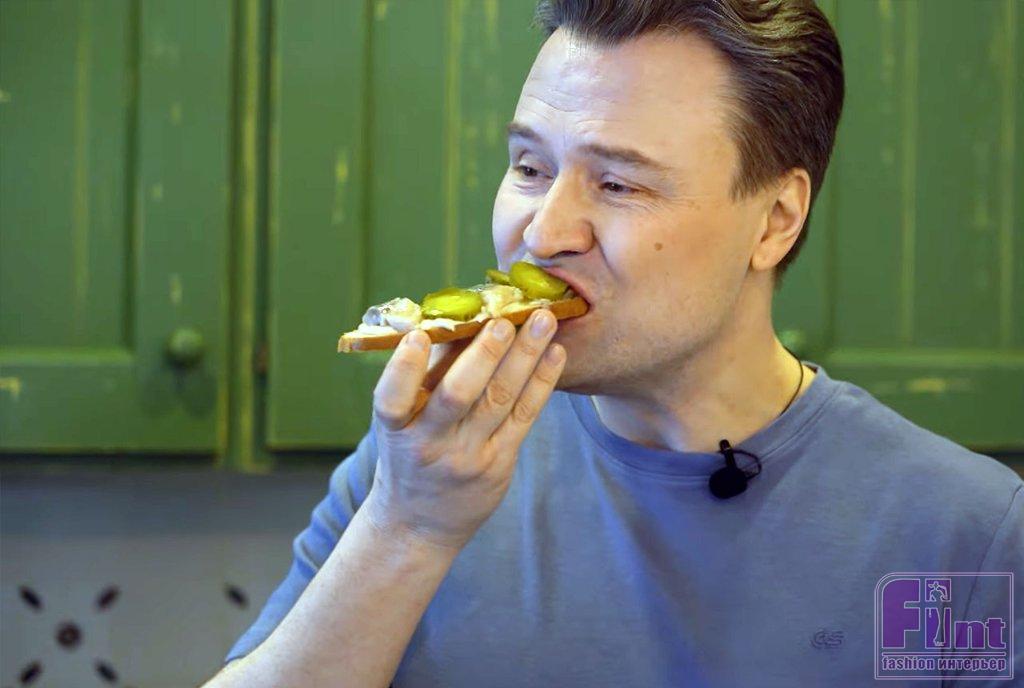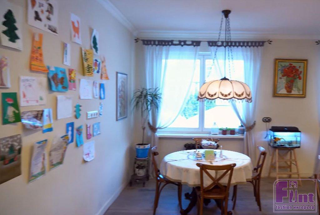 Кухня в доме актёра оформлена в стиле прованс. Необычный кухонный гарнитур с ярким бирюзовым фасадом является основным элементом кухни, совмещённой со столовой зоной. Дополняет интерьер кухни столовая группа под уютным тканевым абажуром, большой кухонный остров и яркая метлахская плитка на полу в зоне приготовления пищи. В кухне-столовой актёра два окна, между которыми установлен небольшой аквариум. В нём обитает любимица семьи – золотая рыбка, а вся свободная стена отдана под галерею детских рисунков.
