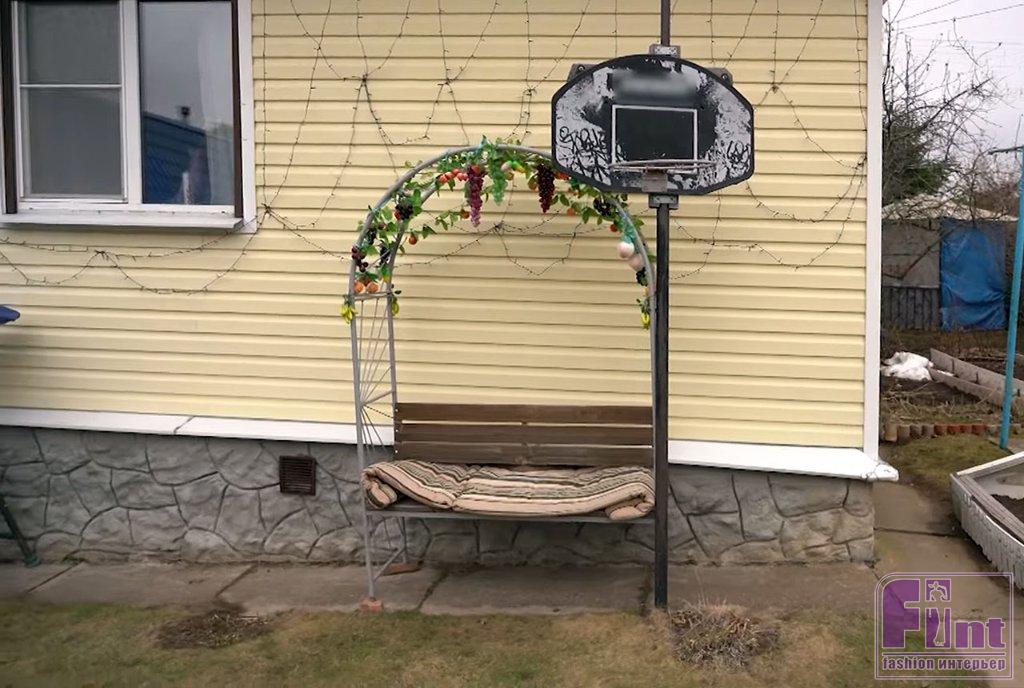 Сразу за воротами, на придомовой территории можно увидеть небольшой, красиво оформленный сад с множеством ландшафтных аксессуаров и садовых фигурок. В углу сада расположена открытая летняя беседка, задрапированная яркими шторами. В беседке установлен садовый диван с двумя креслами и обеденный стол с практичной стеклянной столешницей. Беседка оформлена в этническом стиле, тон которому задаёт тотемная деревянная скульптура, по какой-то причине называемая хозяевами дома «Васей». На участке можно увидеть строительную конструкцию, закрывающую место будущего бассейна.