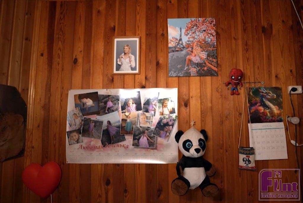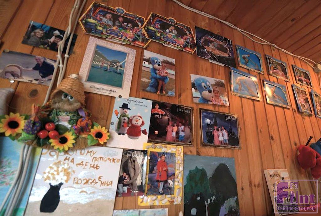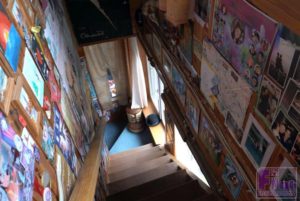 Узкая лестница, ведущая на второй этаж, также украшена огромным количеством детских рисунков, различных фотографий и картин. На втором этаже дома расположена комната, которую хозяева дома в шутку называют «музыкальной гостиной».