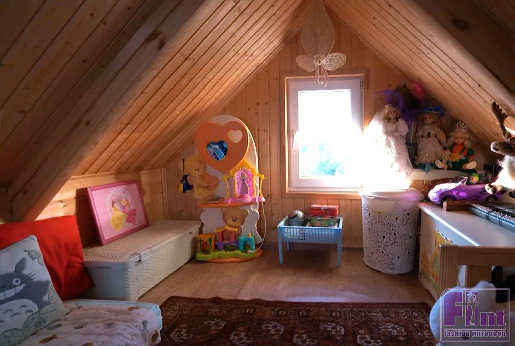 Из «музыкального салона» можно попасть в приватные помещения, одним из которых является мансардный этаж. Чтобы попасть в него, необходимо открыть люк в потолке со складной лестницей. Мансарда полностью отдана под другой мир, в котором очень легко можно перенестись в детство. Огромное количество игрушек, детская мебель и яркий текстиль формируют очень необычный интерьер мансарды.