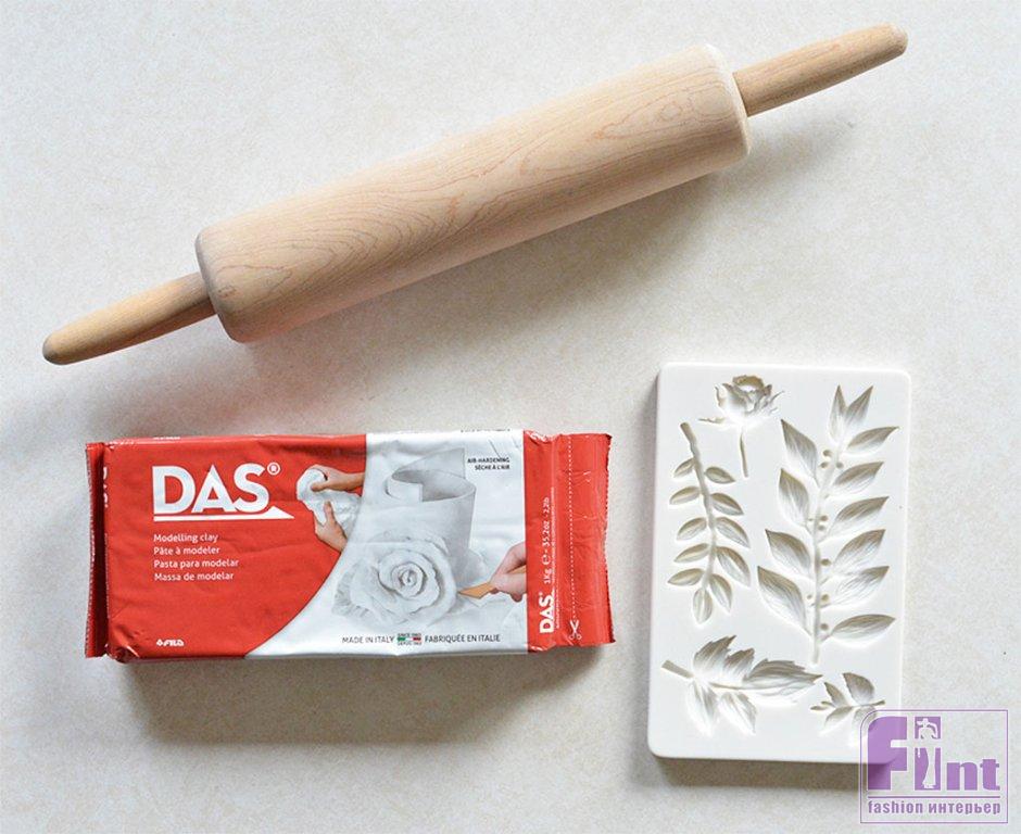 Теперь пришло время создать рельефный декор из полимерной глины с помощью силиконовых формочек. Выдавите полимерную глину в силиконовую форму, чтобы получились веточки с листьями. Удобнее всего это делать с помощью небольшой специальной скалки для работы с полимерной глиной. Скалка позволяет максимально плотно вдавить глину в форму, чтобы добиться идеальной детализации объёмной веточки, и одновременно получить гладкую заднюю поверхность. Срежьте излишки полимерной глины ножом. Разложите листочки на вощеной бумаге или на пергаментной бумаге для выпечки. Срежьте излишки ножом, если они ещё остались на ваших веточках.
