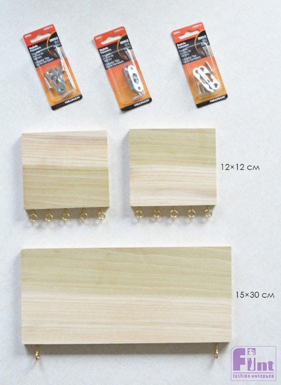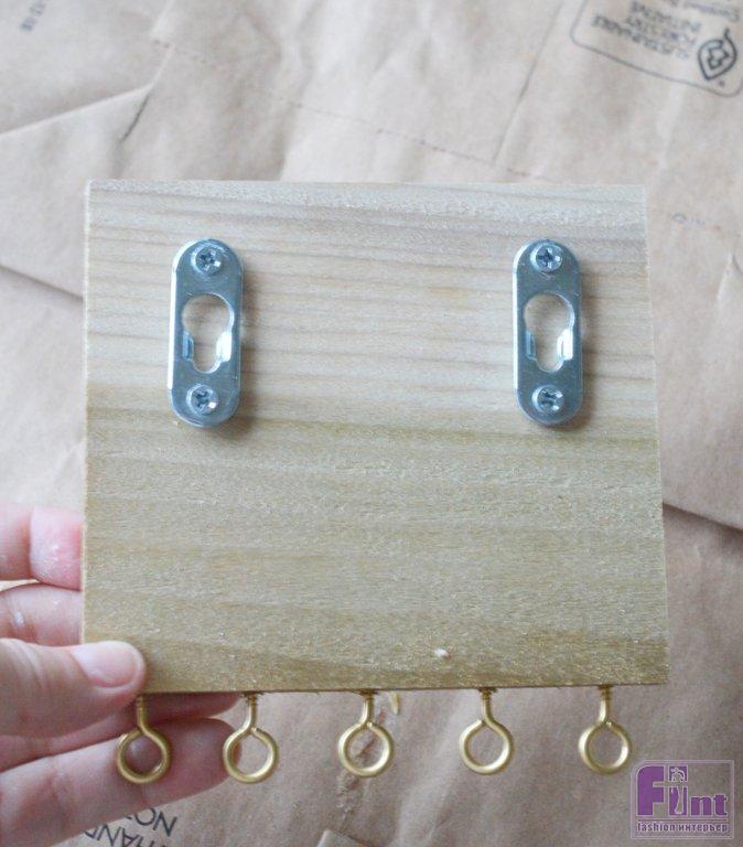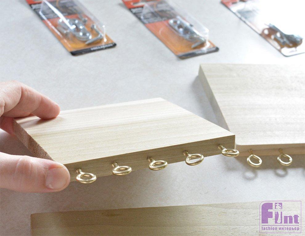 Сначала сделайте деревянные заготовки, отрезав их от доски по нужным размерам. Мы использовали обычную доску толщиной 2 см, которую без труда можно найти в магазинах строительных материалов. Иp этой доски мы вырезали три заготовки: две квадратных (12×12 см) и одну прямоугольной формы (15×30 см). Затем вкрутите в торцы заготовок шурупы с кольцом, равномерно распределив их по длине ребра. На квадратные заготовки установите по 5 шурупов, которые будут выступать в роли держателей серёжек, а на прямоугольную заготовку – 2 шурупа по краям, в которые вставьте металлический стержень для хранения ожерелий, браслетов и цепочек.