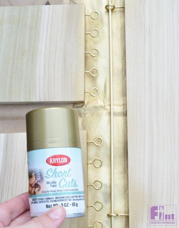 Покрасьте шурупы и стержень с помощью аэрозольной краски, чтобы они были одного цвета, серебристой, золотой или розово-золотистой краской. Мы выбрали для нашего проекта оттенок светлого матового золота.