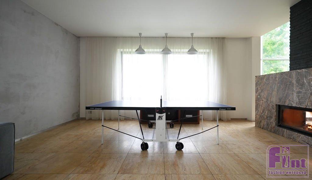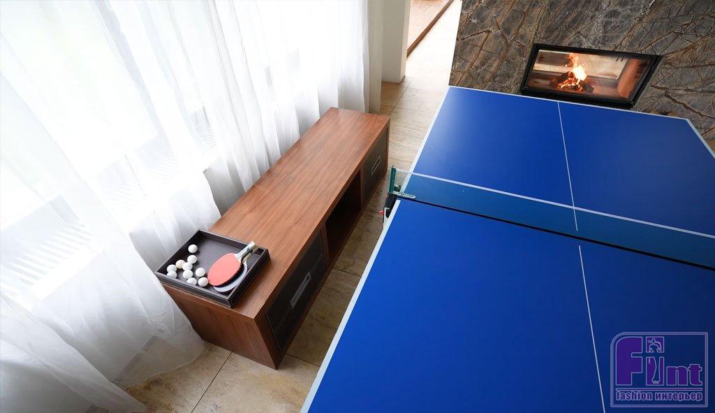 Есть в этом доме место не только для творчества, но и для спорта. Это небольшая (в масштабах остального дома) зона, где стоит стол для настольного тенниса. Юлия говорит, что этот вид спорта помогает ей сосредоточиться. А если не помогает, то актриса стоит в планке или занимается с гантелями. «Может показаться кому-то, что здесь как-то серо и мрачно. Мне наоборот кажется, что здесь такое пространство, вот тебе никакие лишние углы не мешают, тебя ничего не смущает ни физически, ни психически. Ты как в воде. Ничего не сковывает твои движения тут», — рассказывает актриса.