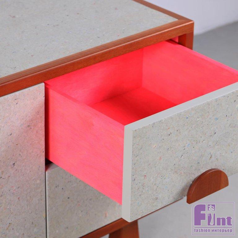 Одна из последних коллекций студии называется «Розовый единорог» и посвящена сказочной теме. Главным источником вдохновения для дизайнеров стал волшебный розовый единорог, образ которого находит отражение в дизайне комода — с деревянными ножками-копытцами и ярко-розовым цветом внутренней отделки ящиков.