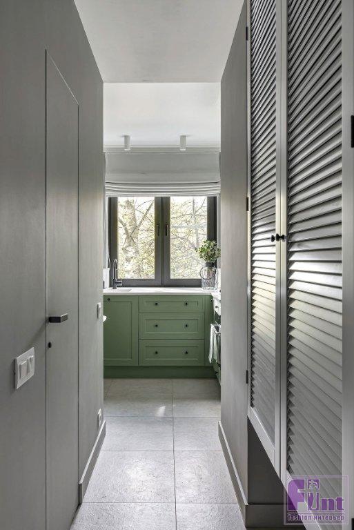 Отличительная черта систем хранения в этой квартире — жалюзийные фасады дверей. Они смотрятся необычно и добавляют уюта. Помимо гардеробной-кладовой, которую выделили на этапе перепланировки, продумано много шкафов. В коридоре, ведущем в комнаты, шкаф для верхней одежды. А в коридоре, который ведёт из прихожей на кухню, подвесной хозяйственный шкаф. Под ним место для зарядки робота-пылесоса и туалет для кота. Причем в этом шкафу поставлена сушильная машина. Шкаф сделали усиленной конструкции, что позволило такое размещение.