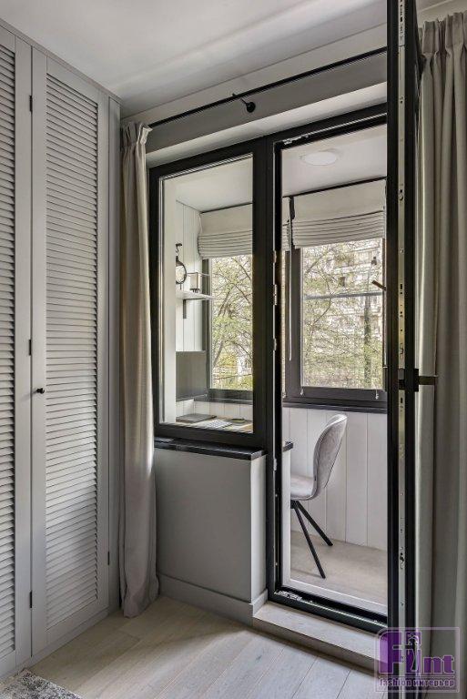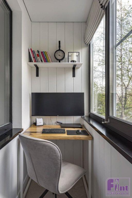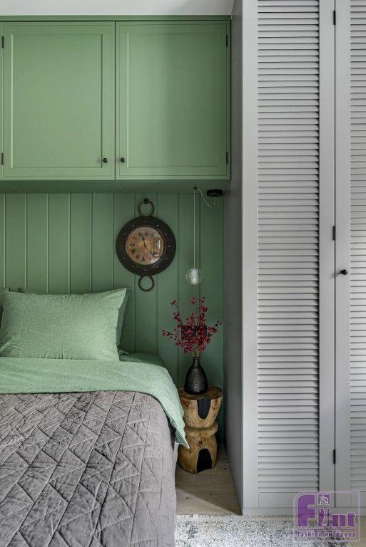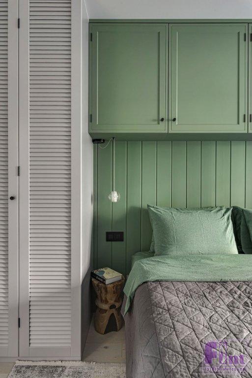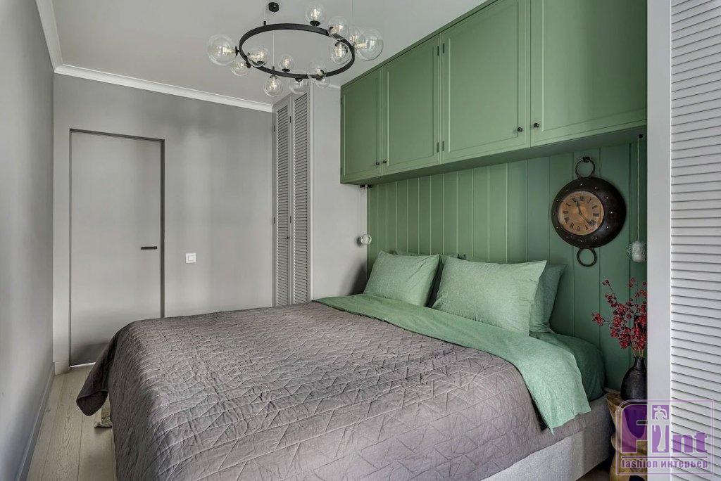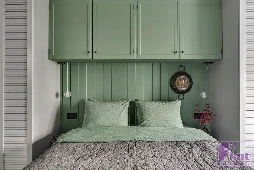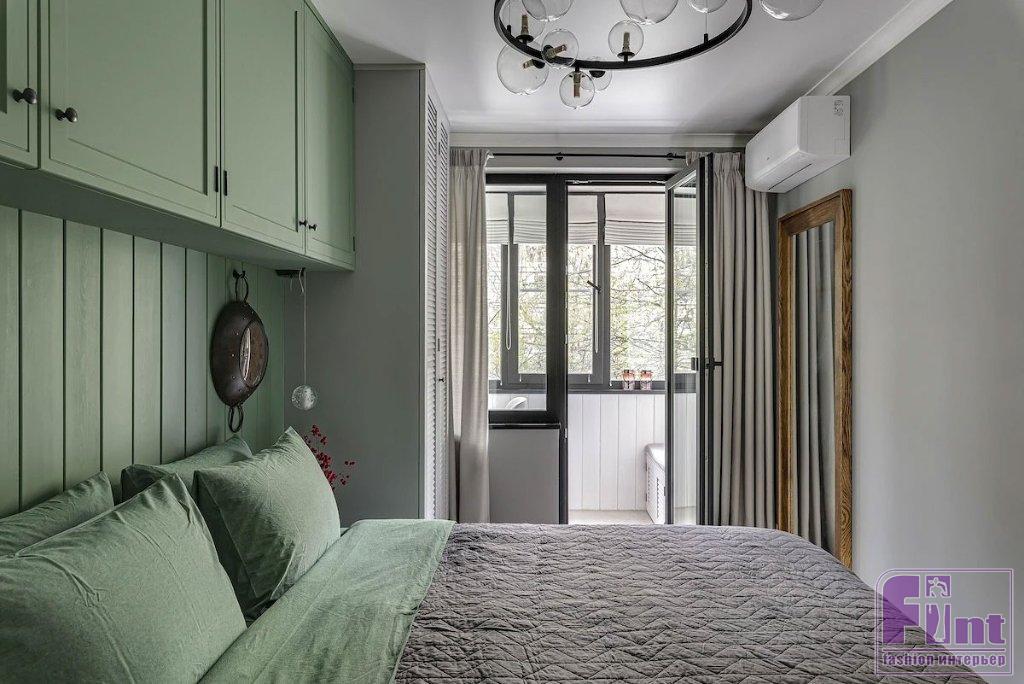Спальня — узкая комната, поэтому место для шкафов нашлось только по бокам от кровати. Они разделены на мужской и женский. Для дополнительного хранения — шкафы над кроватью. На балконе в спальне оборудовано рабочее место. Оно предназначено для хозяйки квартиры. Здесь также предусмотрели скамью с мягким сидением и спинкой. Внутри скамьи — места для хранения.