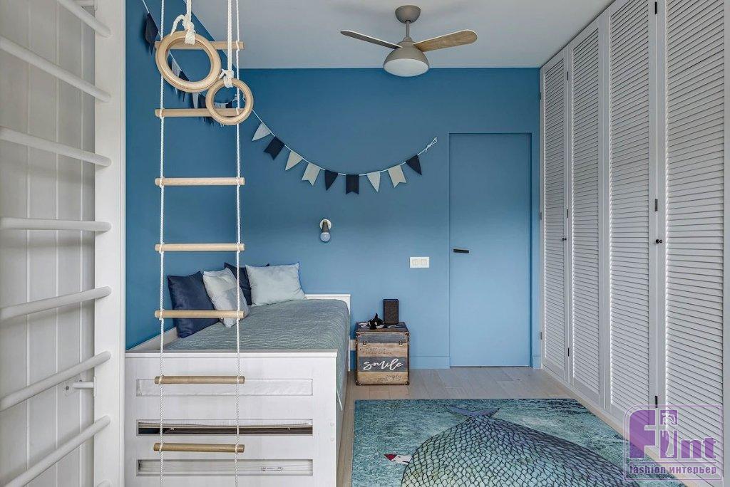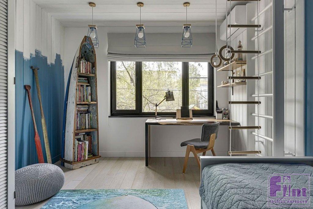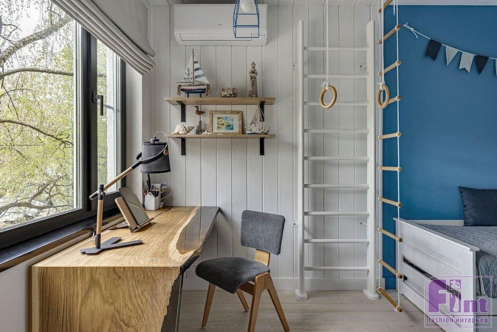 Во входной зоне поставили обувницу и повесили крючки для верхней одежды. Планкен защищает окрашенную стену от повреждений и быстрого износа. В детской большой шкаф установлен вдоль стены напротив кровати, в самой кровати предусмотрены выдвижные ящики. Рабочее место — у окна, на стене рядом с ним навесные полочки. Также в детской продуман спортивный уголок в виде шведской стенки. Книжки хранятся на стеллаже, сделанном из старой деревянной лодки. Это неслучайный выбор, как и предметы декора, а отсылка к увлечению мальчика морской тематикой, кораблями и яхтами.