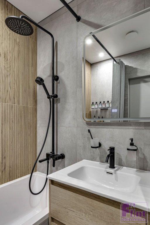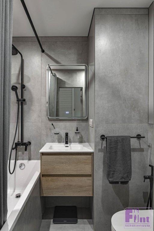 Для ванной комнаты выбрали керамогранит под серый бетон. Использовали его и для стен, и для пола. Стену над ванной оформили керамогранитом под дерево. Керамогранит уложили также на утеплённом балконе в спальне, в прихожей и на полу кухни. Пол в коридоре и жилые комнаты (гостиная, детская, спальня) выложены инженерной доской.