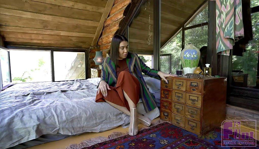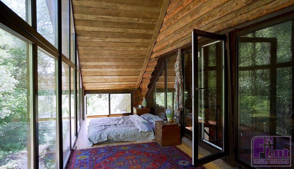 Мансарда в доме Рады Русских вся выполнена из стекла. Это было сделано специально, чтобы организовать там спальню с максимально открытым пространством и высоким потолком. В качестве прикроватных тумбочек в спальне Русских выступают старые библиотечные картотеки, которые отлично подошли по стилю к интерьеру спальни.