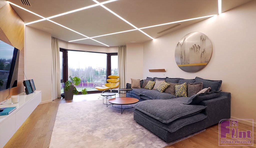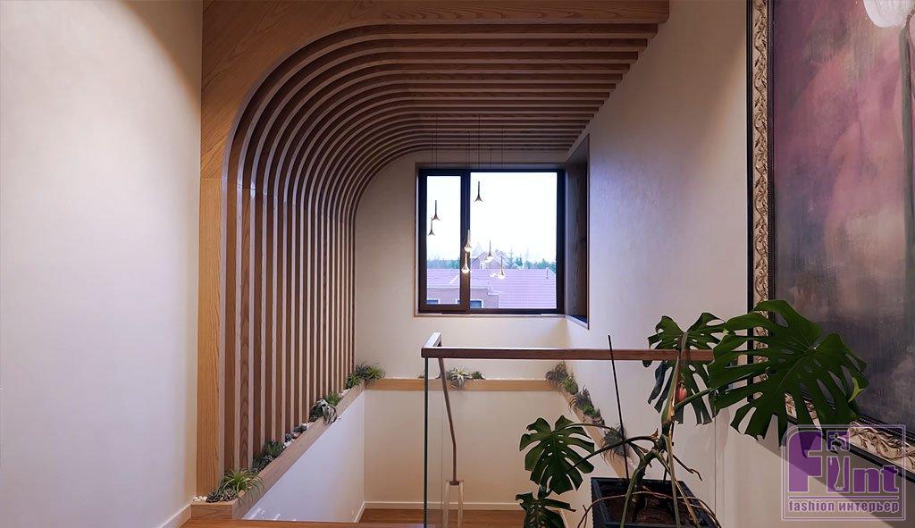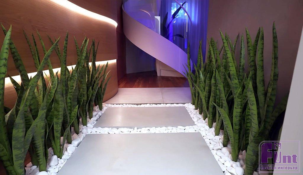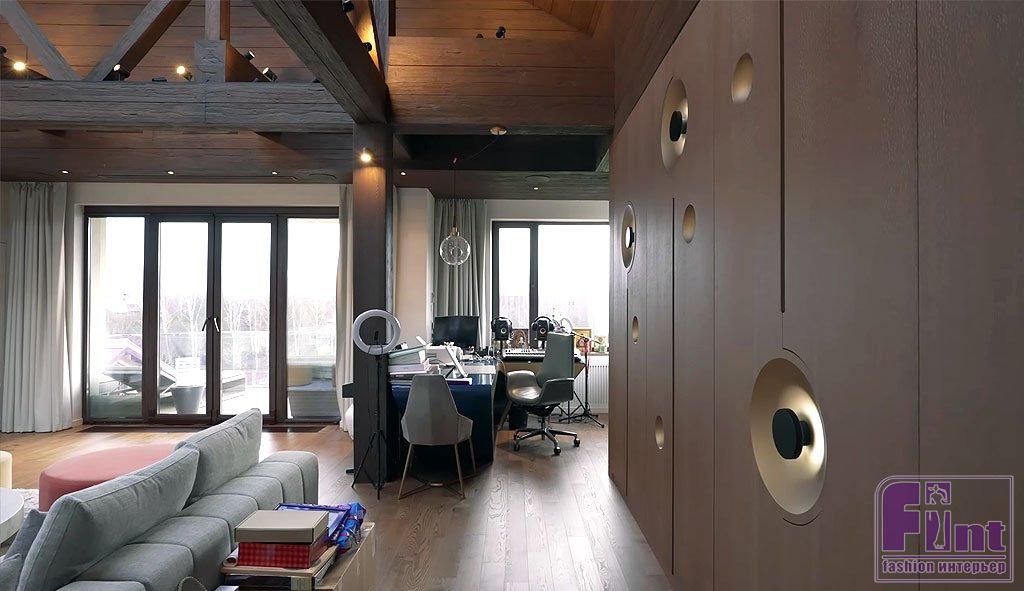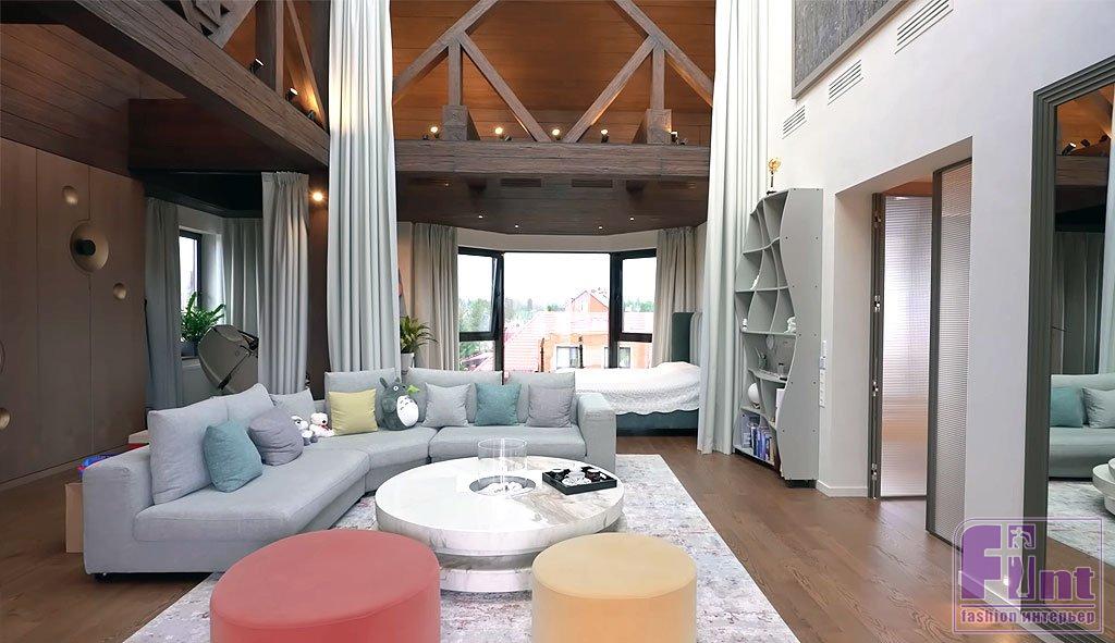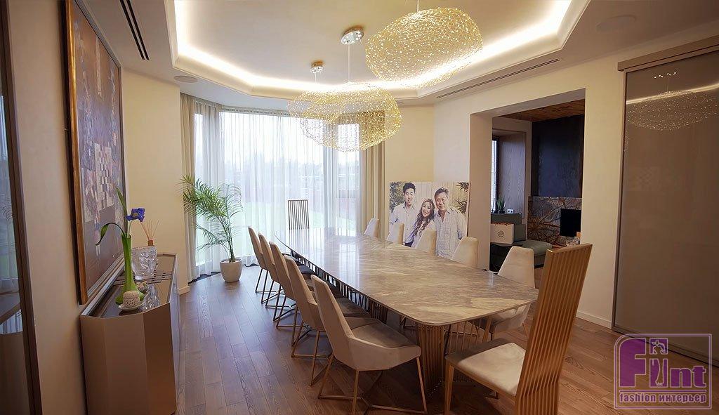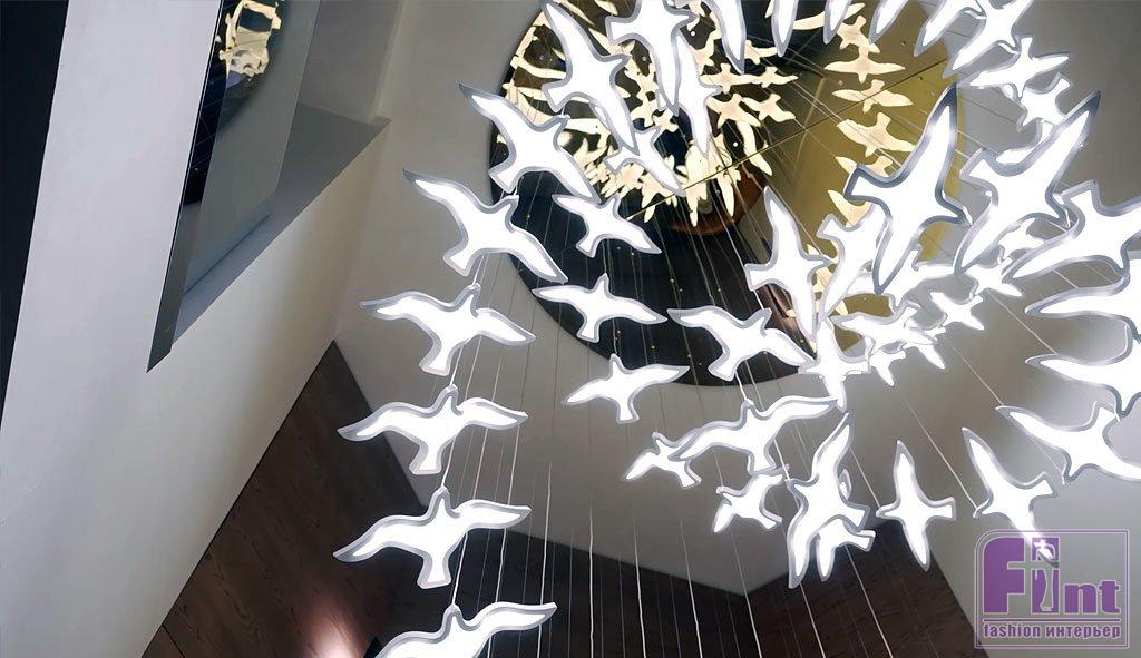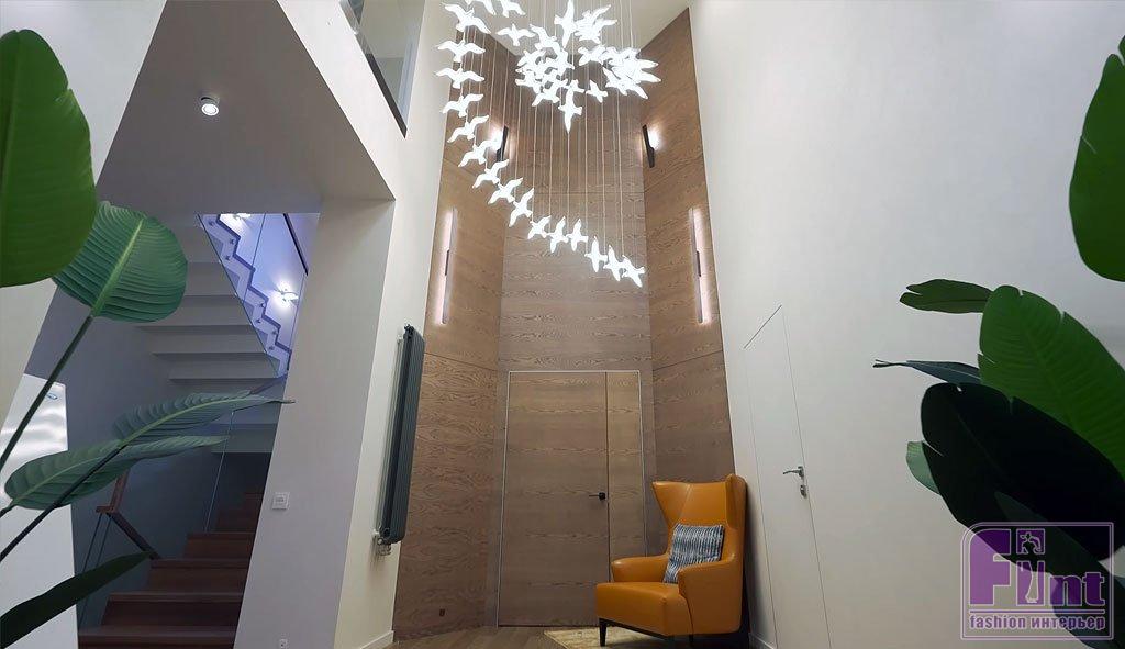 Дом начинается с парадного входа, лестницы и уникальной спиралевидной люстры, которая изображает нежных птиц, взлетающих ввысь в зеркальное отражение позолоченного круглого декоративного элемента потолка. Этот приём с отражением и позолотой позволяет дополнительно насытить внутреннее пространство отражённым мягким светом, что очень комфортно смотрится в зимнюю пору.