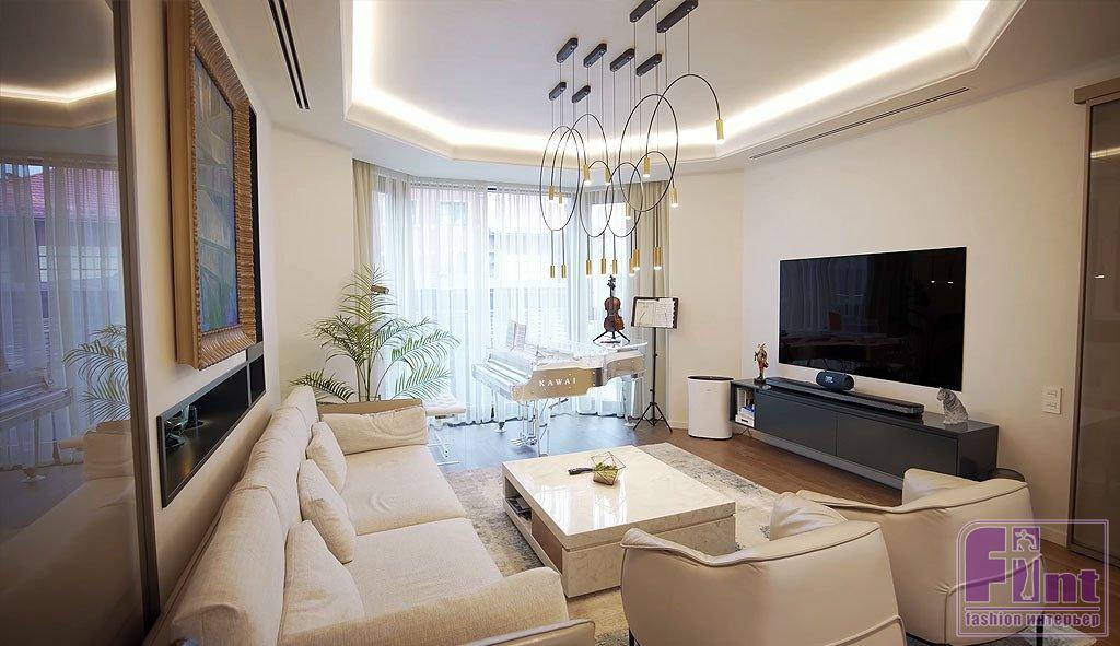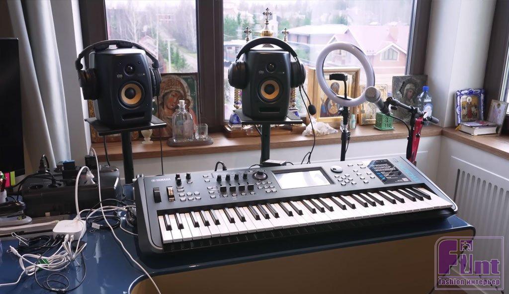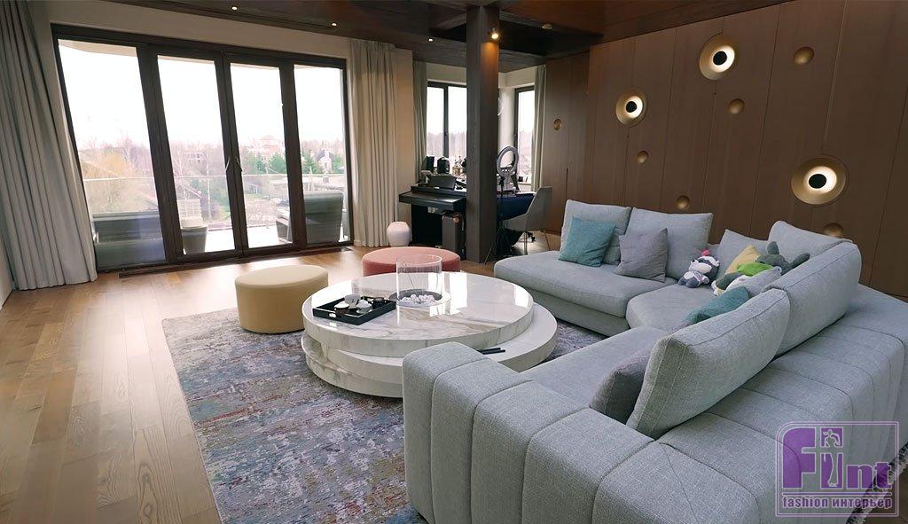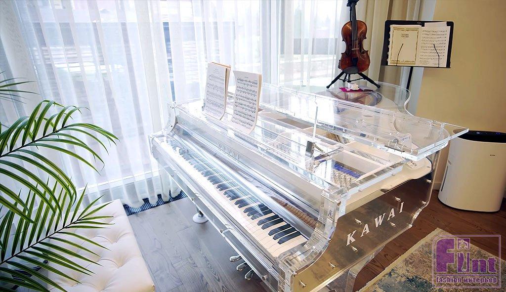 Свет попадает в просторную светлую гостиную. Причём сразу бросается в глаза уникальный полупрозрачный рояль, стоящий внутри эркера, что насыщает музыкальный инструмент светом со всех сторон, а само пространство образует как бы импровизированную сцену. На рояле виднеется альт – ещё один музыкальный инструмент, которым в совершенстве владеет знаменитая звезда эстрады.