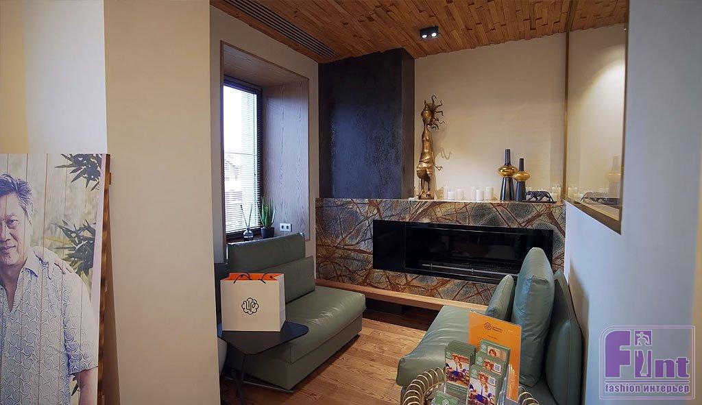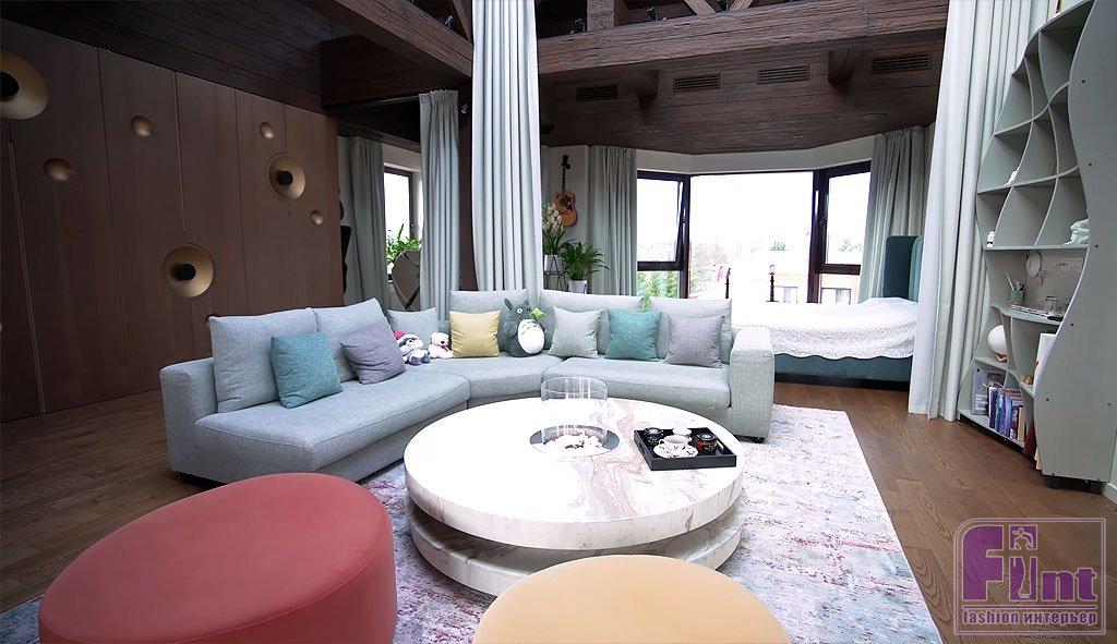 Ещё один интерьерный акцент – это осветительные приборы в виде облаков. Кстати, тем самым автор дизайна интерьера придерживался общего концепта и в освещении, так как большинство осветительных приборов «пляшут» от спиралевидной люстры при входе в особняк. Из гостиной одна дверь удобно ведёт в каминную зону. Причём камин – искусная подделка, включающаяся с кнопки пульта дистанционного управления.