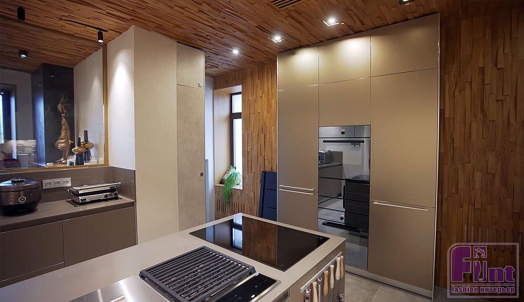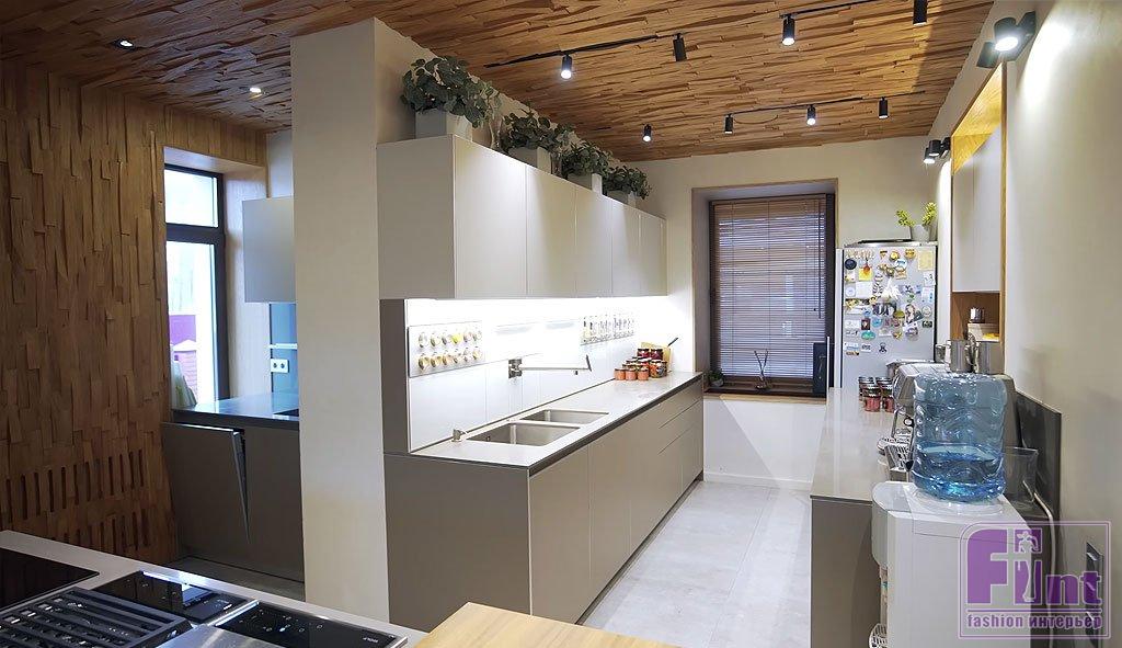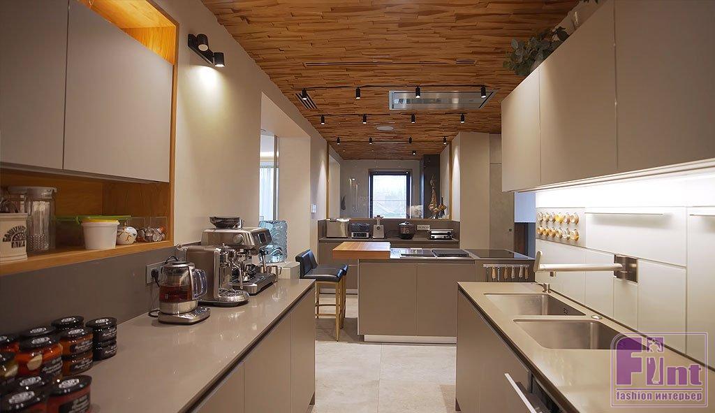 Кухню сразу выгодно выделяют большие стильные светлые шкафы «в потолок», которые буквально излучают минимализм фасадов, несмотря на то, что внутри имеется великое множество полезных отсеков. Вокруг шкафов, поднимаясь от серой мраморной плитки пола, идут декоративные паркетные деревянные дощечки с искусственными деликатными неровностями в некоторых местах, которые так же плавно переходят на потолок.