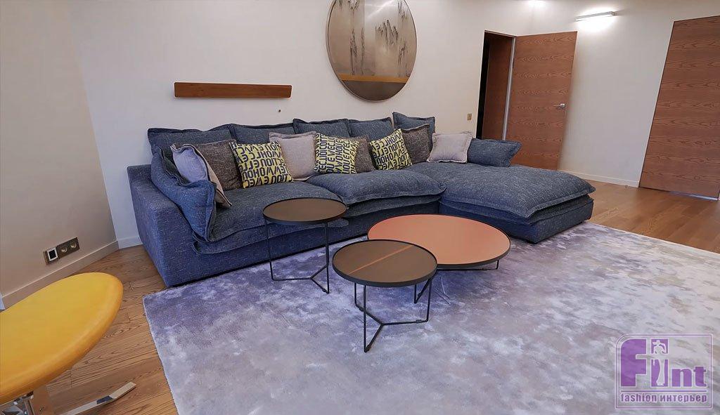 В гостиной имеется большой телевизор «парящий» над продолговатой тёмно-серой тумбочкой. И телевизор, и тумба – единственные чёрные предметы в данном помещении. Но с другой стороны на противоположной стене есть тёмно-серая, перевёрнутая Г-образная панель, «поддерживающая» картину в деревянной раме, что создаёт видимую общность пространства. Помимо мягкого уголка, буквально созданного для комфортных посиделок с друзьями, в гостиной имеется большой стол для приёма пищи, окружённый стульями с тонкими ножками, что делает интерьер гостиной воздушным и лёгким.