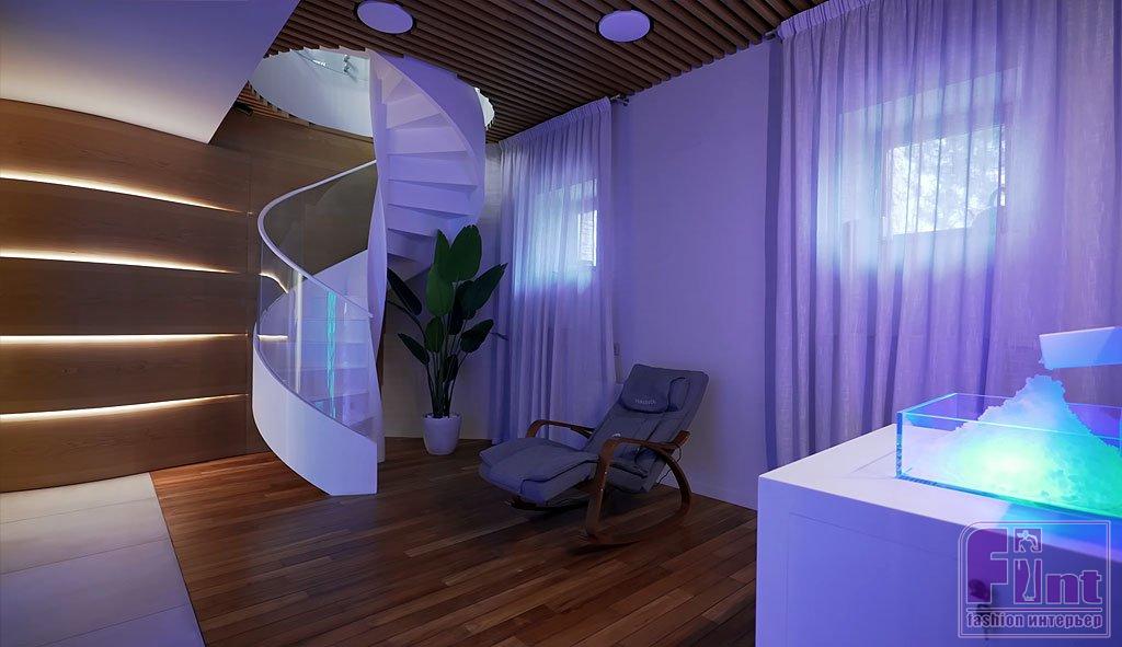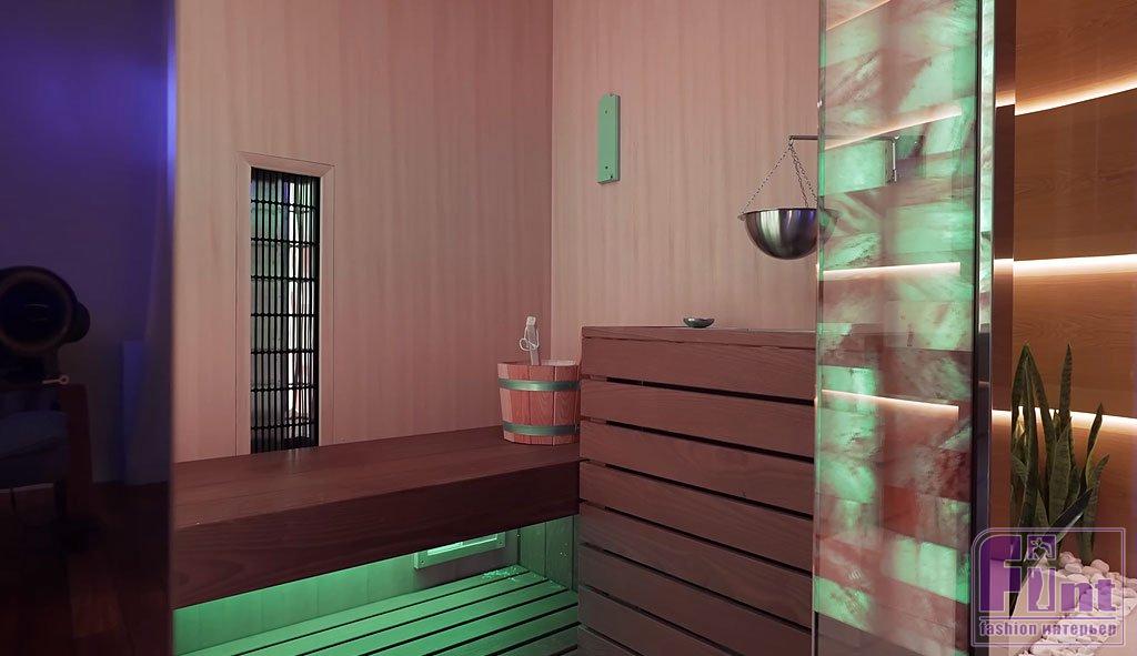 Здесь же имеется инфракрасная сауна, которая изумительно подходит для того, чтобы в комфортных условиях «слить» несколько литров воды при отёчности. Так как у Аниты имеются определённые проблемы с задержкой воды, данное устройство именно «необходимость» в доме, а не какое-то роскошество. В ванную комнату нужно именно «погружаться» по отдельной винтовой лестнице. Причём атмосферу релакса и единения с собой сразу создаёт освещение – смесь естественного света из небольших окон, стандартных светильников в потолке и декоративных светильников, встроенных в продолговатые бороздки «неровной» стены.