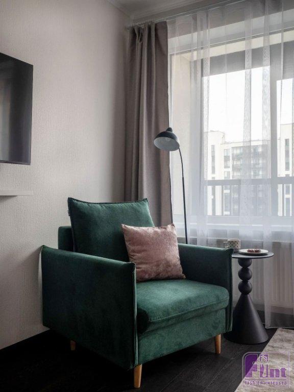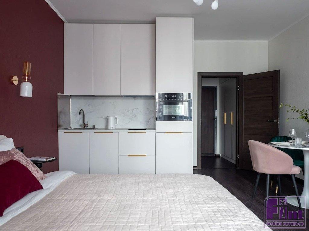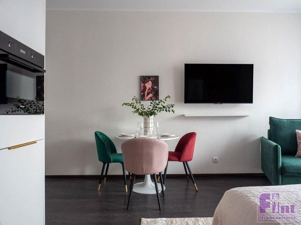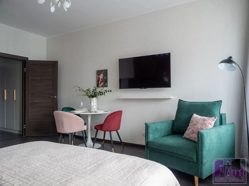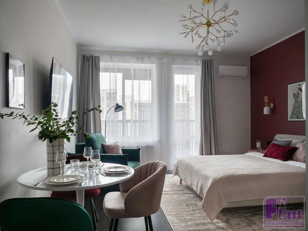 Эта квартира находится в новостройке Санкт-Петербурга. Хозяева обратились к хоумстейджеру Елене Винокуровой. Хоумстейджер — относительно новая профессия. Они готовят квартиры к аренде или продаже. В этом случае было необходимо обустроить студию с ремонтом от застройщика для краткосрочной аренды. Было важно сохранить существующую отделку, но сделать пространство привлекательным, выделяющимся на фоне других предложений. Решение нашлось — эффектный цвет.