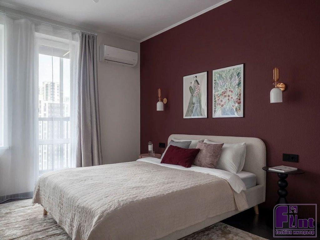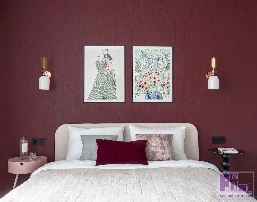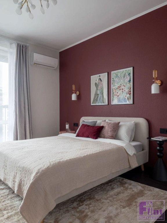 Для покраски обоев выбрали моющуюся краску. Фоновым стал светлый, почти белый оттенок. В изголовье кровати решили сделать акцент, для этого выбрали красивый винный цвет. Именно цветовой акцент должен привлечь внимание арендаторов, по мнению Елены.