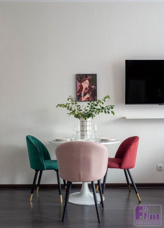 «Я выбрала три основных цвета: винный, розовый и зелёный. Причем добавляла их очень дозировано, используя нейтральную базу — белые стены, кухня, шкаф, стол, бежевая кровать с пледом и шторы. Таким образом, получилось одно крупное насыщенное пятно — винная стена — и несколько ярких акцентов в виде мелкой мебели и декора. Интерьер бросается в глаза, но в нём очень комфортно находиться, так как цвет добавлен дозировано. У меня были определённые ограничения при работе — это отделка от застройщика, которую нужно было сохранить, и скромный бюджет, не позволяющий сделать перепланировку или использовать какие-то сложные и дорогие решения. И была только одна возможность вытянуть этот интерьер — за счёт цвета и грамотного расположения мебели. И я использовала это по максимуму», — комментирует свой проект Елена.