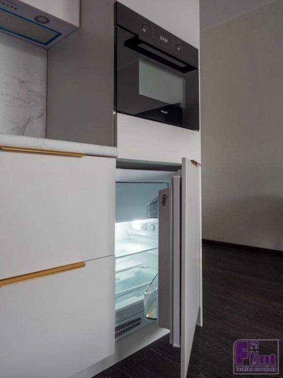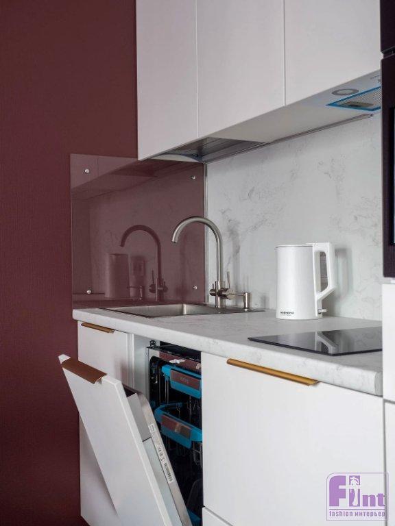 Основное место для вещей — шкаф в прихожей на три секции. Одна из секций предназначена для верхней одежды, вторая — для повседневных вещей, а третья закрывается на ключ, там предполагается хранить инвентарь для уборки и запасы различной бытовой химии. Маленький гарнитур включает максимум необходимой техники: в колонну встроили духовой шкаф с функциями микроволновки, а вниз — мини-холодильник. Под столешницей установили посудомоечную машину, на рабочей поверхности — варочную панель на две конфорки. Над ней — вытяжка.