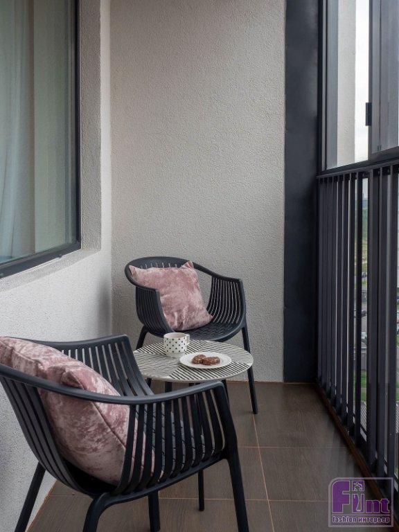 Основное спальное место — двуспальная кровать, которую Елена подобрала в модной обивке букле. Предусмотрено и раскладное кресло на случай, если в квартире решит остановиться семья с ребёнком, например. Обеденная зона тоже рассчитана на троих гостей. На балконе оборудовали летнюю зону отдыха — пара кресел и маленький кофейный столик. В ванной комнате поставили тумбу с раковиной и подвесили шкафчик над стиральной машиной.