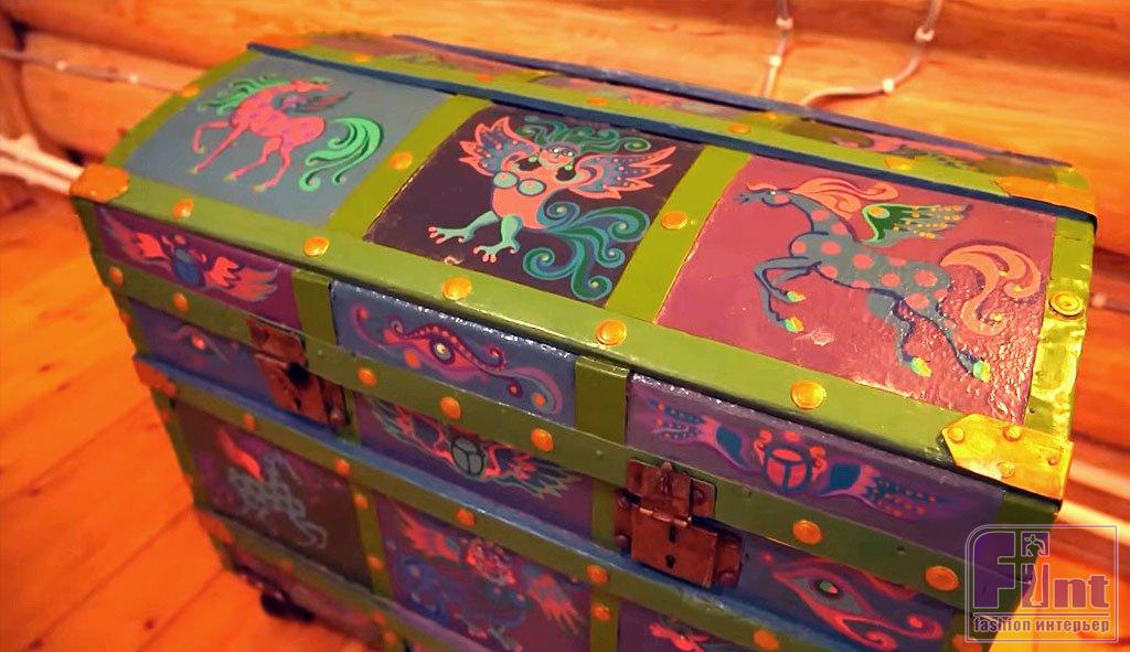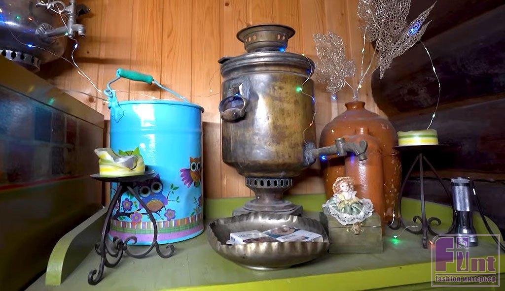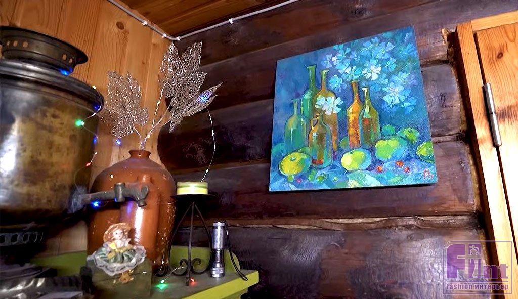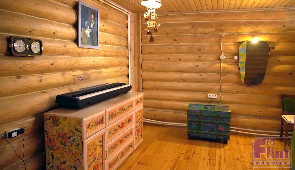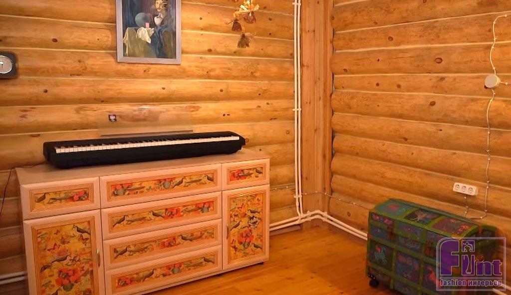 На первом этаже в доме актёра также расположилась просторная гостиная, наполненная удивительно красивой мебелью, оформленной в технике декупаж. Здесь же нашёл своё место в интерьере вручную расписанный старинный сундук и удивительно красивая ширма с восточном стиле. Центром притяжения гостиной является русская печь, на которой каждый кирпич раскрашен в яркий жизнерадостный цвет, благодаря чему печь очень органично вписывается в интерьер гостиной, добавляя сочных красок деревянному интерьеру.
