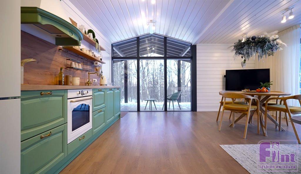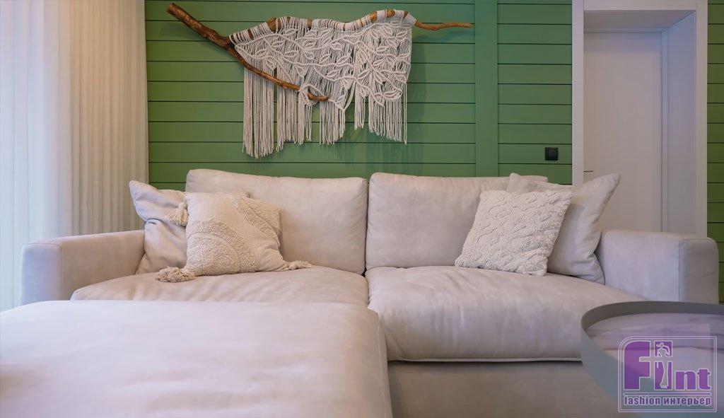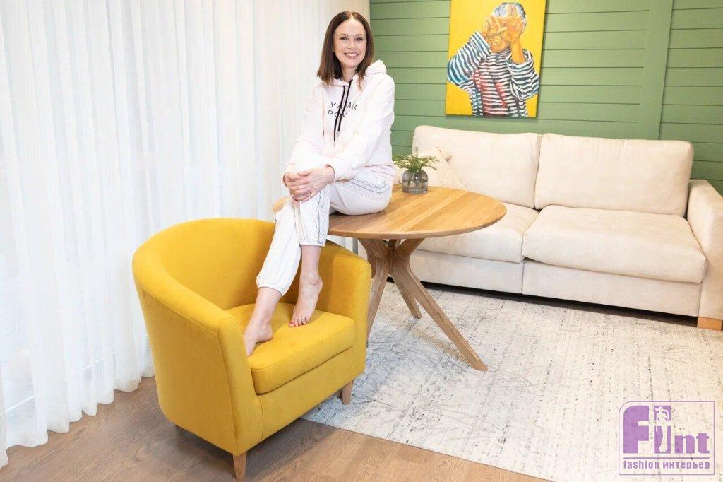 Цвет фона интерьера загородного дома актрисы – белый. Это отличный фон, на который «нанесены» другие цвета: бежевый, как продолжение стилистики нюдовых стен, зелёный, подчеркивающий близость к природе, и горчичный, добавляющий настроение цветения, словно только что распустившихся ромашек. Первая комната, с которой нас знакомит хозяйка — это гостиная, совмещённая с кухней. Интерьер кухни-гостиной сразу намекает, что дом новый, ведь еще совсем недавно, 10-15 лет назад, было не принято объединять пространства, и делать меньше стен и дверей.