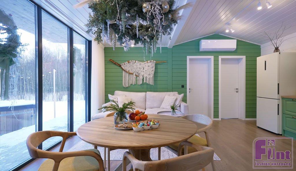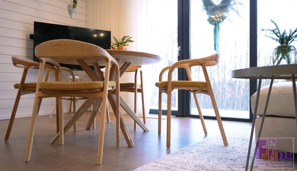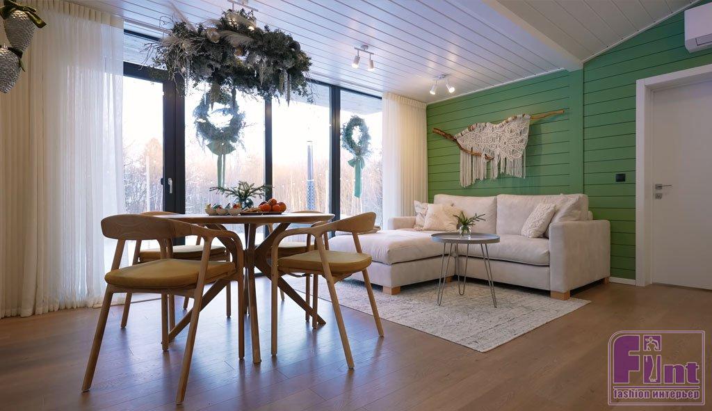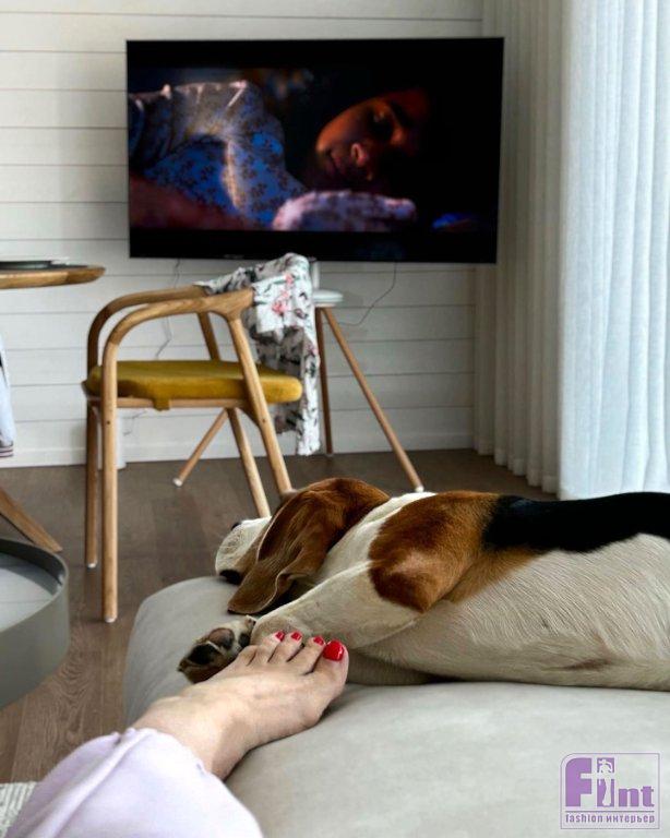 Зона гостиной в загородном доме Ирины Безруковой имеет меньше отсылок к классике, нежели кухня. Здесь уже преобладает модерн, причем достаточно минималистичный. Телевизор, мягкий диван, кофейный столик и обеденная группа — это весь мебельный набор. Но благодаря зелени и декору, комната не выглядит пустой. Напротив, она достойно уютная. Здесь хочется отдыхать и пить чай, укрывшись пушистым пледом.