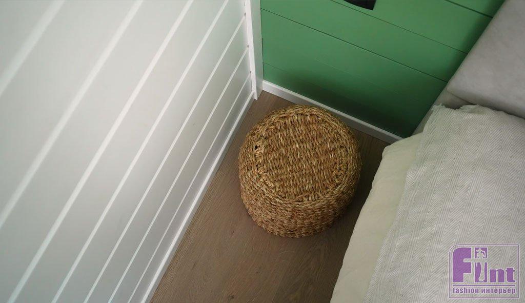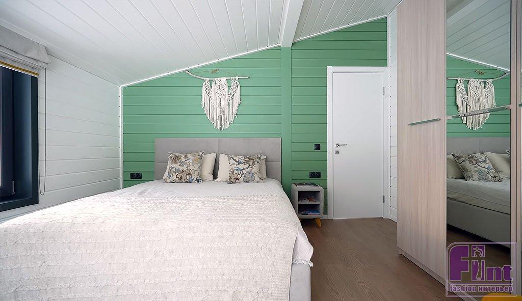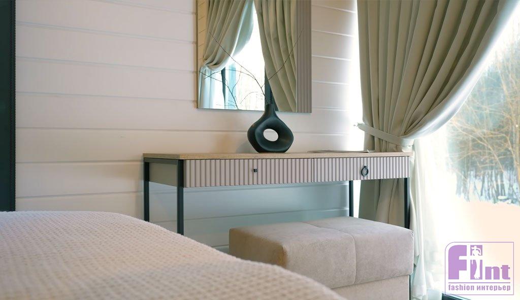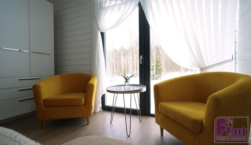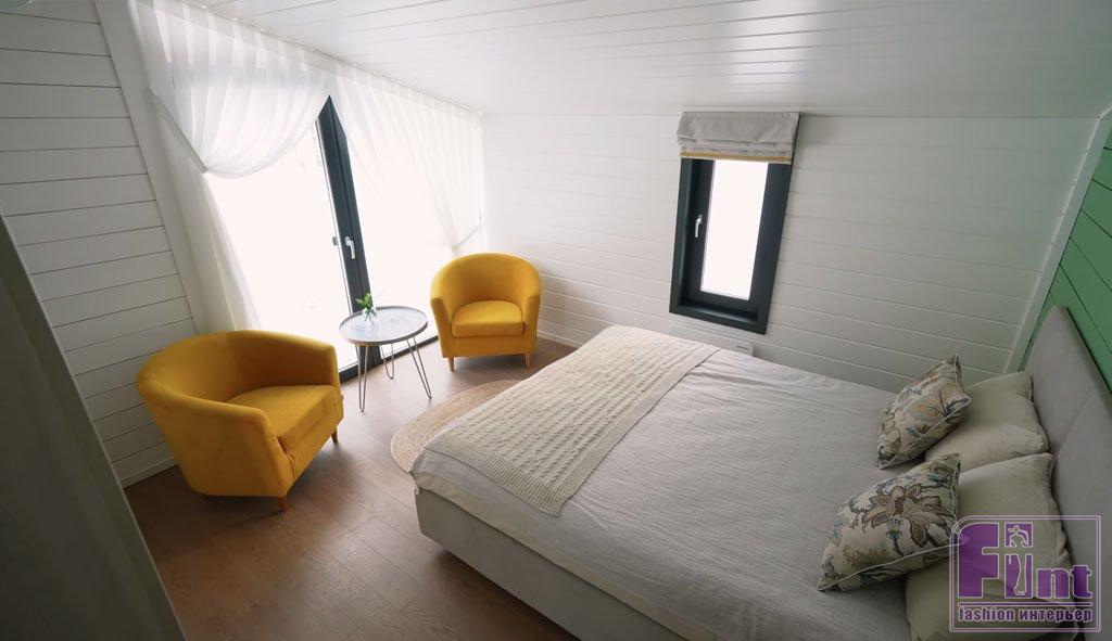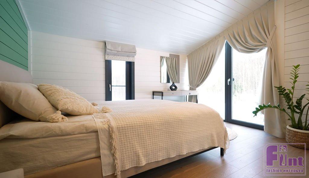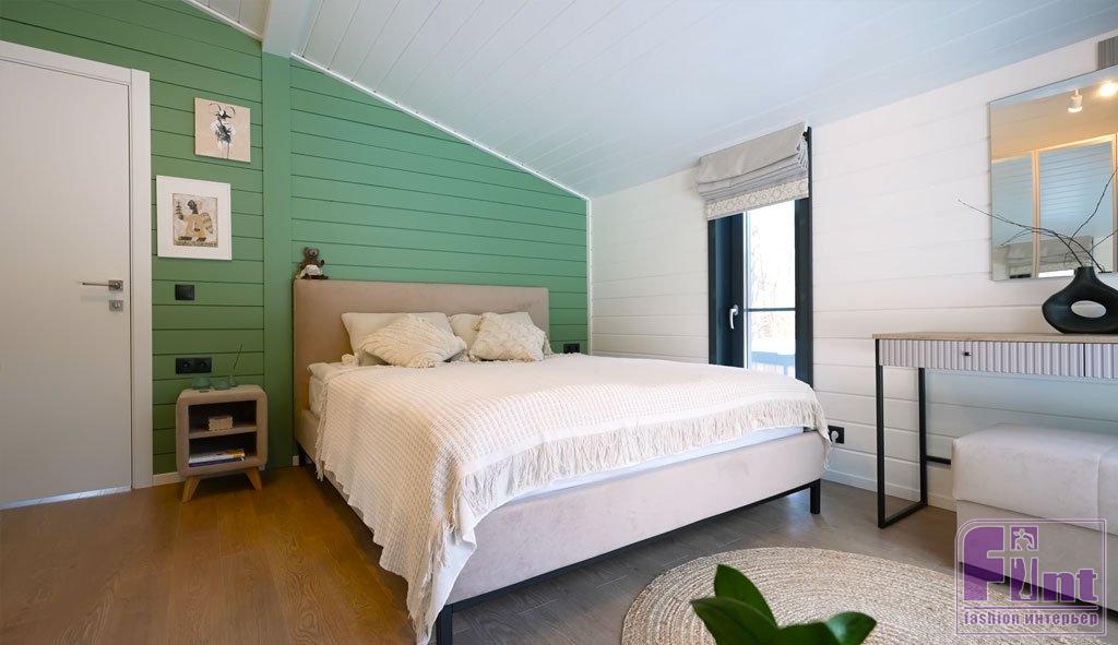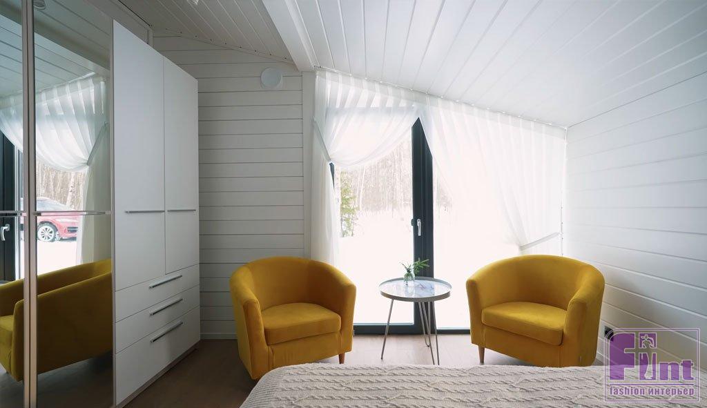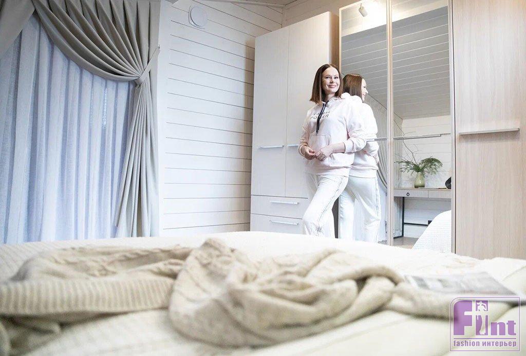 Попадая в спальню, мы сразу отмечаем, что она выполнена в едином стиле со всем домом. Однако в этом комнате мы отмечаем и другие цвета: горчичные оттенки и песочные орнаменты добавляют особого уюта и красок. Таким образом, Ирина вновь отдаёт предпочтение минимализму, но не холодному и отчужденному, а теплому и притягательному.