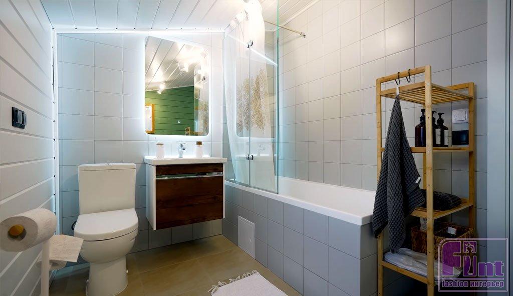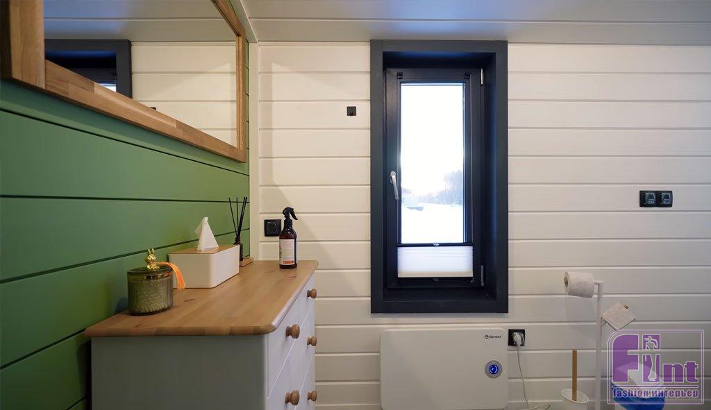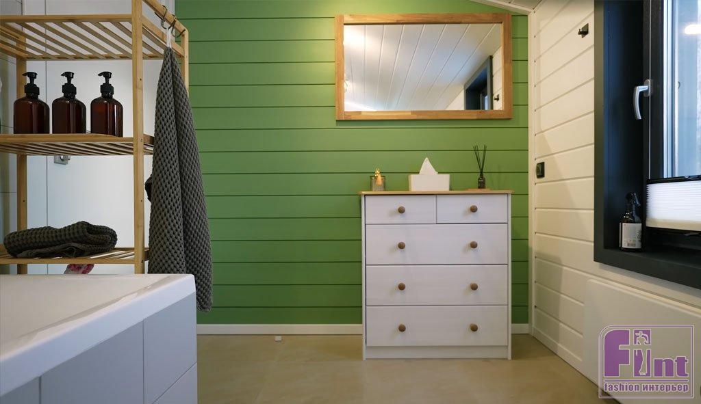 Что касается ванной комнаты, то она достаточно просторная. На её площади поместилась полноценная ванна со стеклянной перегородкой, раковина с тумбой, комод с косметическими принадлежностями и даже этажерка с многочисленными баночками и тюбиками. Нужно сказать, что в целом перед нами предстает некое место силы. Дом, где актриса восстанавливает свое ментальное здоровье, питает дух и укрепляет тело. Эта концепция прослеживается и во внутреннем, и во внешнем убранстве дома.