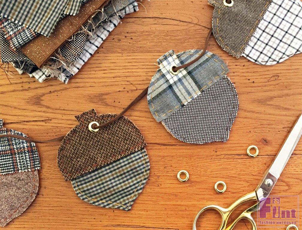 Наверняка, в каждом доме найдутся подходящие обрезки ткани и кусочки шерстяных полотен, и мы предлагаем забавный способ использовать эти обрезки. Шерстяная ткань прекрасно ассоциируется с осенним сезоном, благодаря своей тёплой и уютной текстуре. Нужно лишь подобрать подходящую для этой гирлянды цветовую гамму. Каждый элемент гирлянды в виде жёлудя мы снабдили фетровой подложкой, что придаёт ему приятный вес. Чтобы связать жёлуди вместе, мы использовали латунные люверсы и кожаный шнурок натурального коричневого цвета.