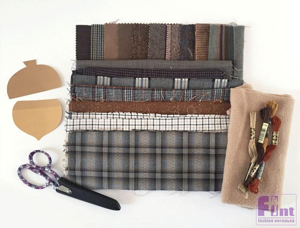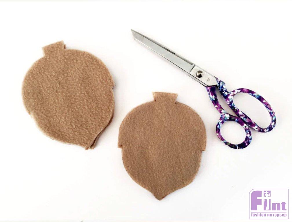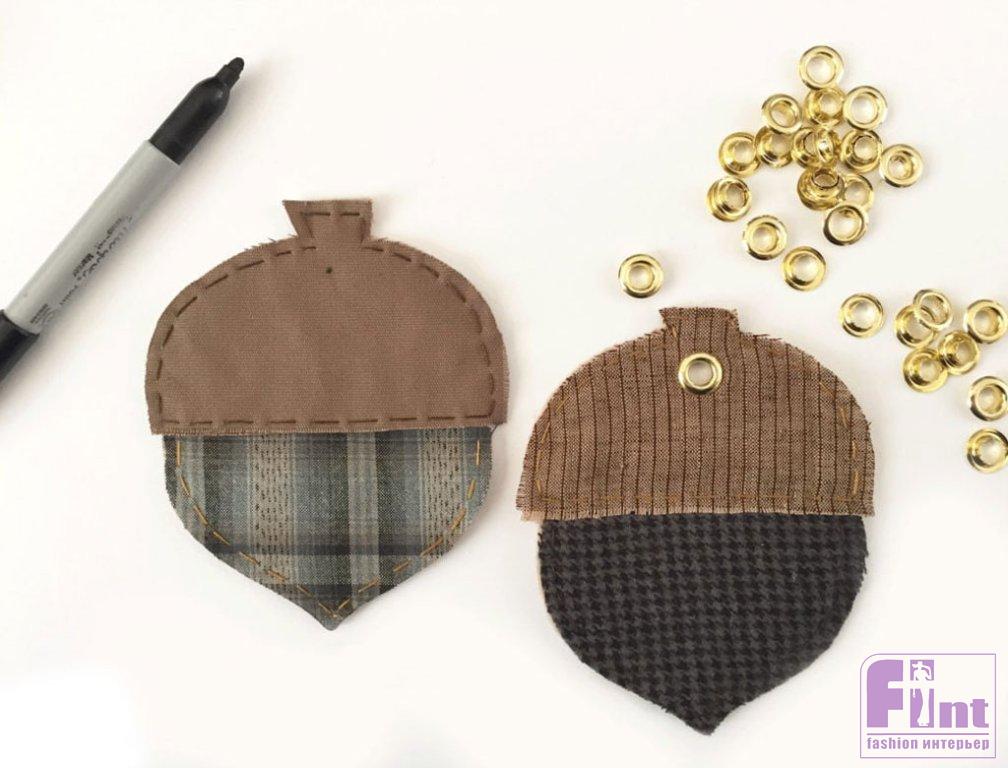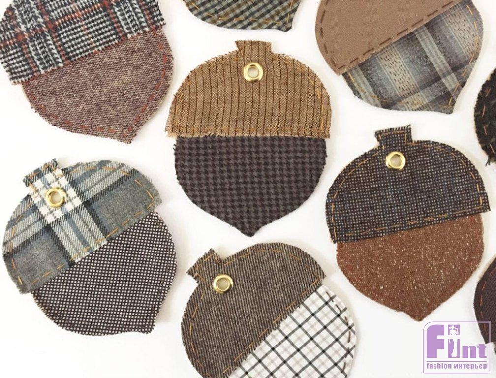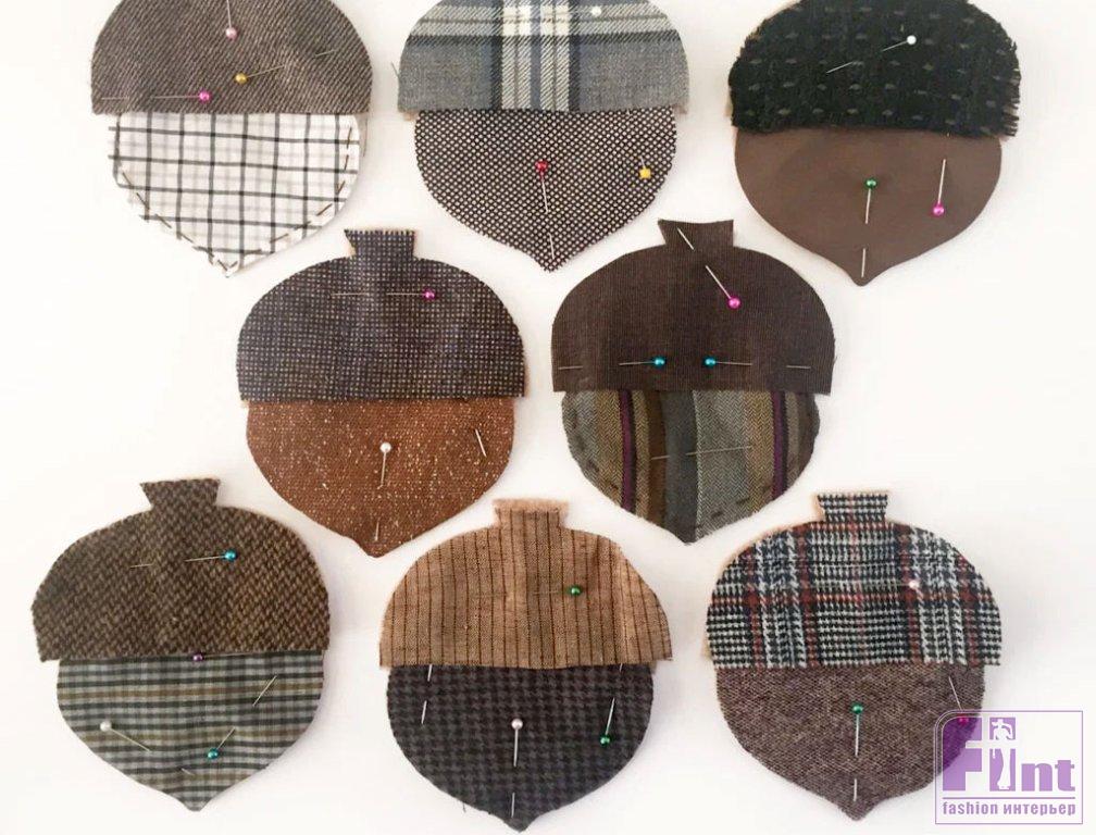 Вырежьте кусочки ткани по шаблону жёлудя. Такие шаблоны можно без труда найти в интернете, или нарисовать самостоятельно – они очень простые. У каждого желудя будет верхушка («шляпка»), низ (сам жёлудь) и подкладка. Комбинируйте ткани с различным цветом и узором, чтобы получились красивые жёлуди. Соединив две части шаблона жёлудя, вырежьте необходимое количество подложек.